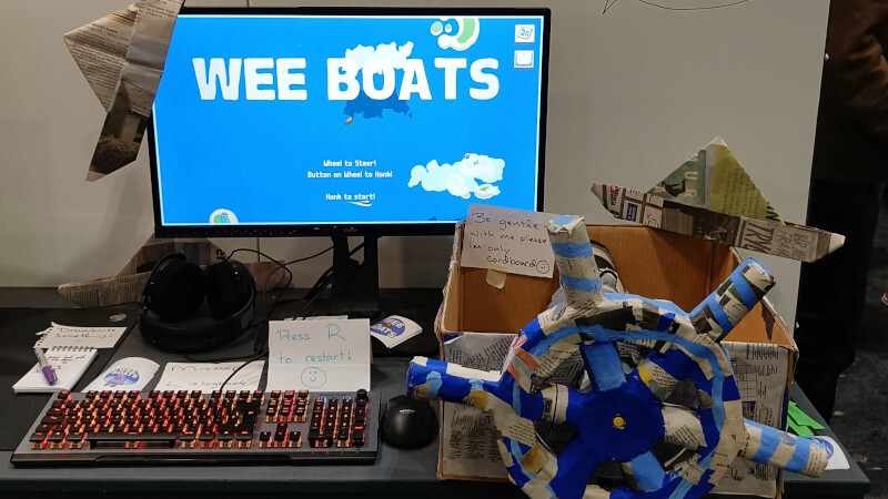 Our papier-mache Wee Wheel alt controller returned to action at the booth allowing players to physically steer the boat and honk their horn!