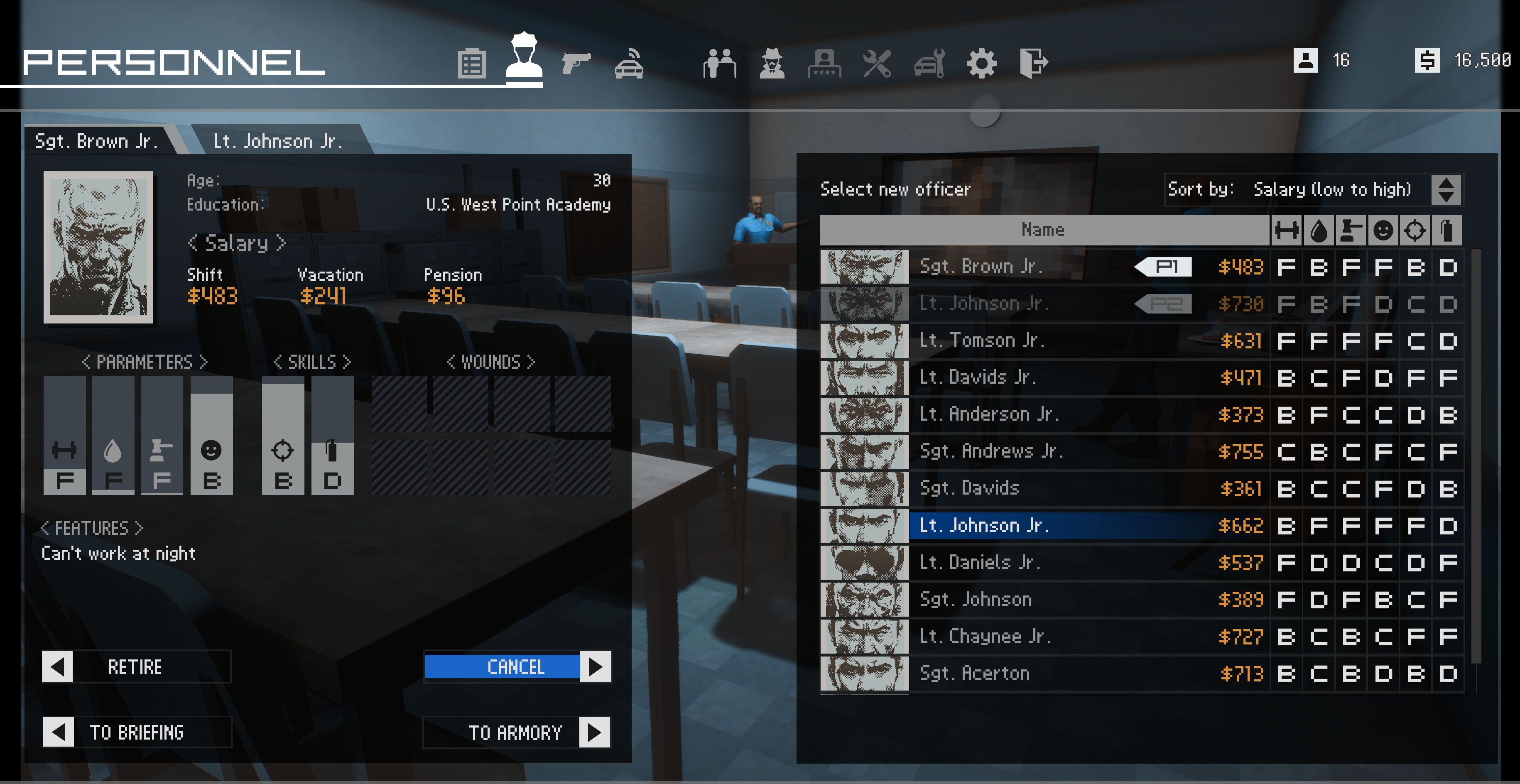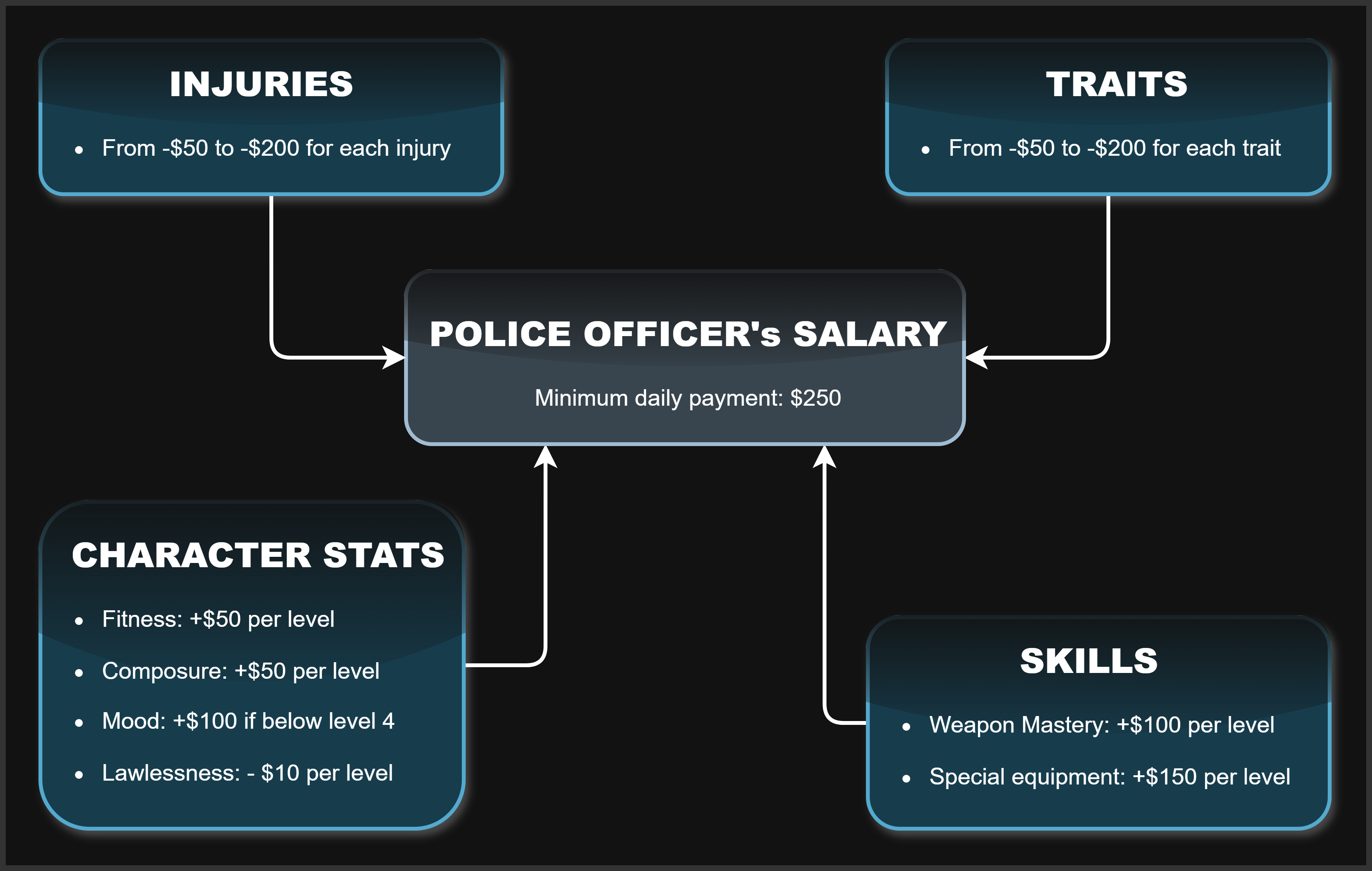 The police officers you hire are ordinary people. They have preferences, features, and the hard work will leave them with old wounds, even injuries. Remember that every cop you command is a living person, and ignoring their needs will get you into big trouble.