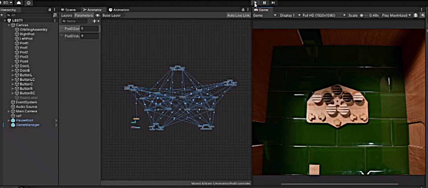 All of this was absolutely essential and it helped Ben & myself a lot that we built an organizational architecture together before we started. This way we could always easily see what was done, what still needed doing & where are assets all were. While corridor rooms (rooms with only doors in them) were relatively simple, puzzle rooms get pretty darn complex. This puzzle room, for example, was made from 28 separate stopmotion animation clips, and Ben put them all together using the media player in Unity and a lot of careful thought and imaginative thinking to make it all work based on mouse click inputs: