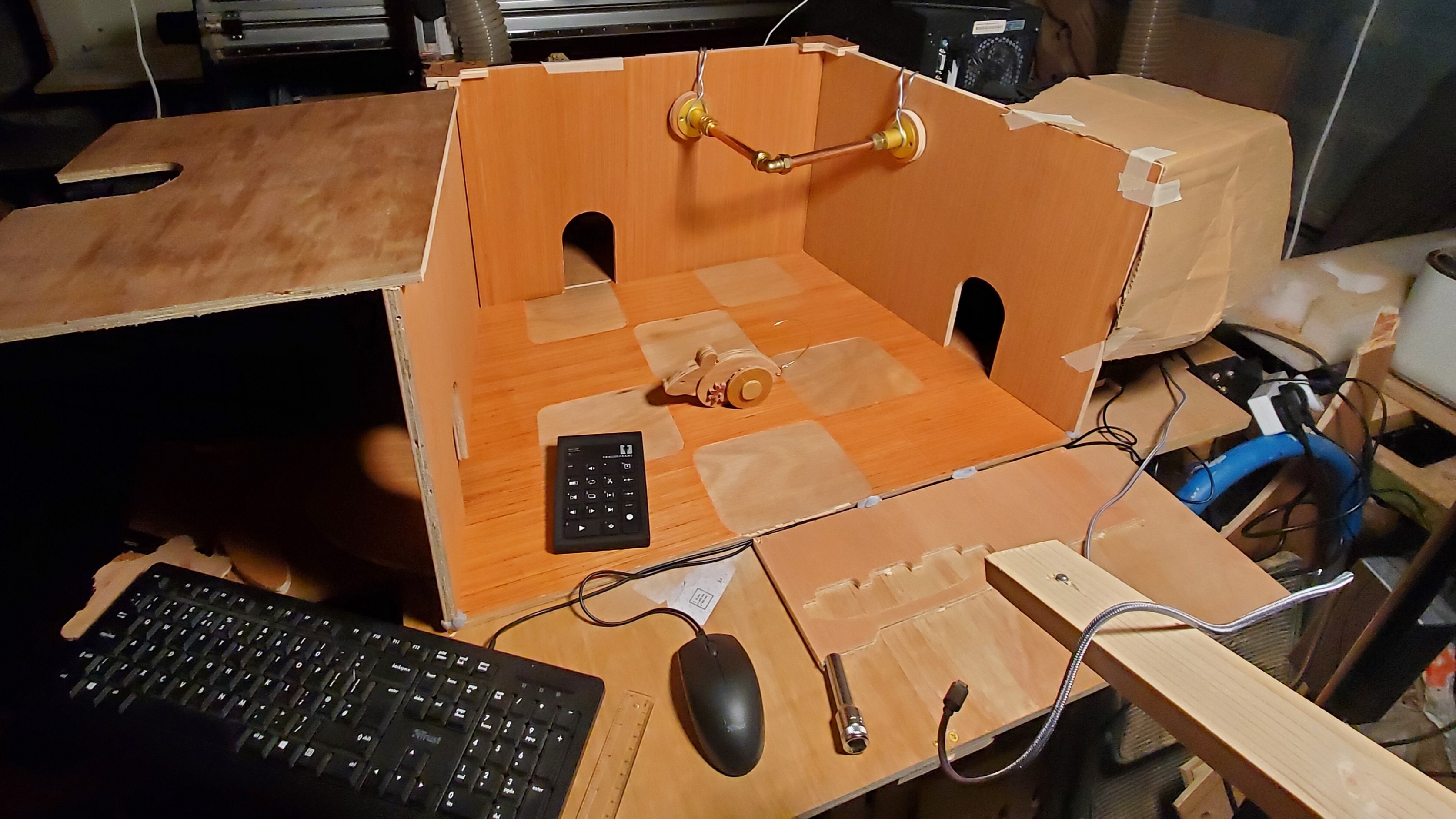 That's my 1250x1250mm CnC routing table I normally use to build parts for live theatre sets, and is also the tool I used to carve all the wooden parts for the maze, puzzles, puppets and set pieces for our game. It doubles as an excellent stopmotion animation table, as it's massively heavy & quite rigid and therefore doesn't vibrate much or shift position if you bump into it or lean against it. Add in the fact that, with the lights switched off, my shed is dark inside even in the middle of the day, & you have the makings of a pretty decent place in which to animate... especially considering our lack of budget!