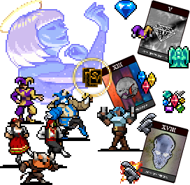 Survarots are a new form of power creep that is currently usable by the character Secretino and all the Ante Chamber characters. They are vaguely similar to Arcana cards, but are themed after characters from Vampire Survivors and provide different types of bonuses.