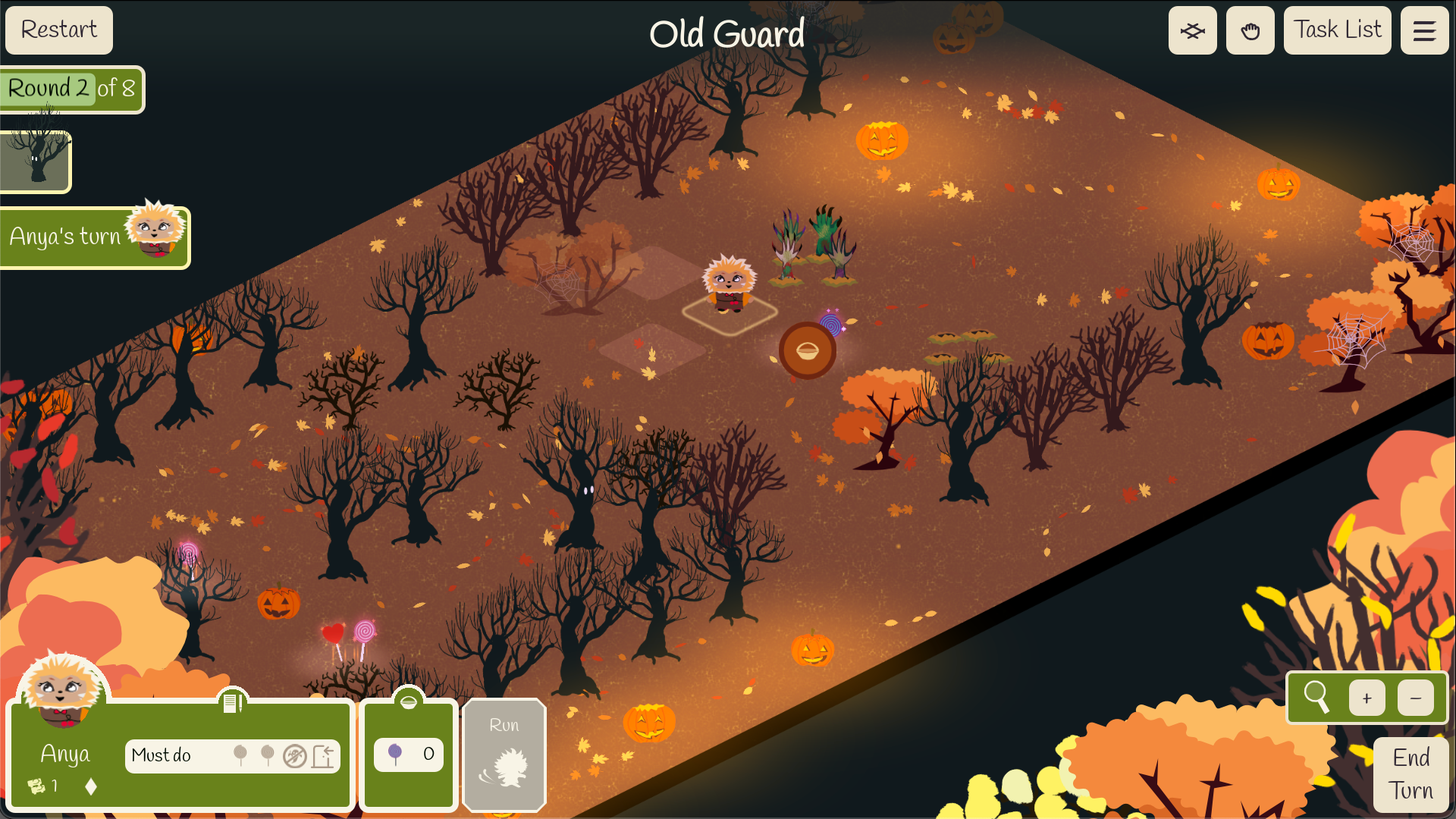 Anya — has a Run ability: she moves faster for one turn but can't take other actions while running.