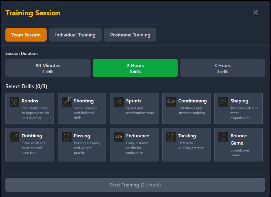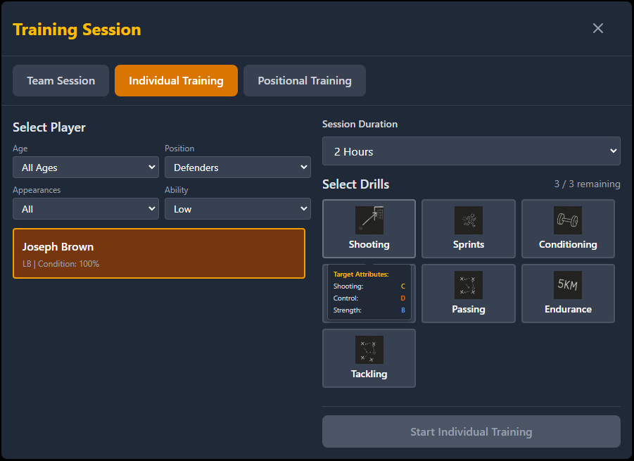 Next up e have a revamp of the training section. I've changed the way this displays to ensure you can see everything without scrolling endlessly in both the individual and the team training sessions.