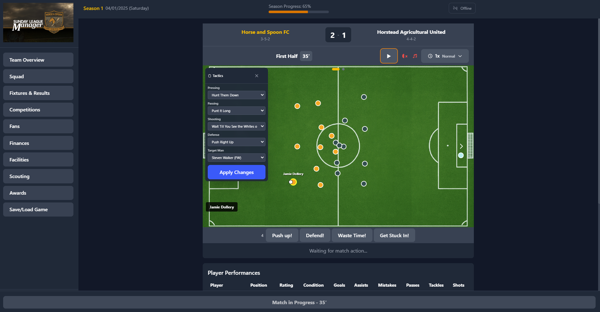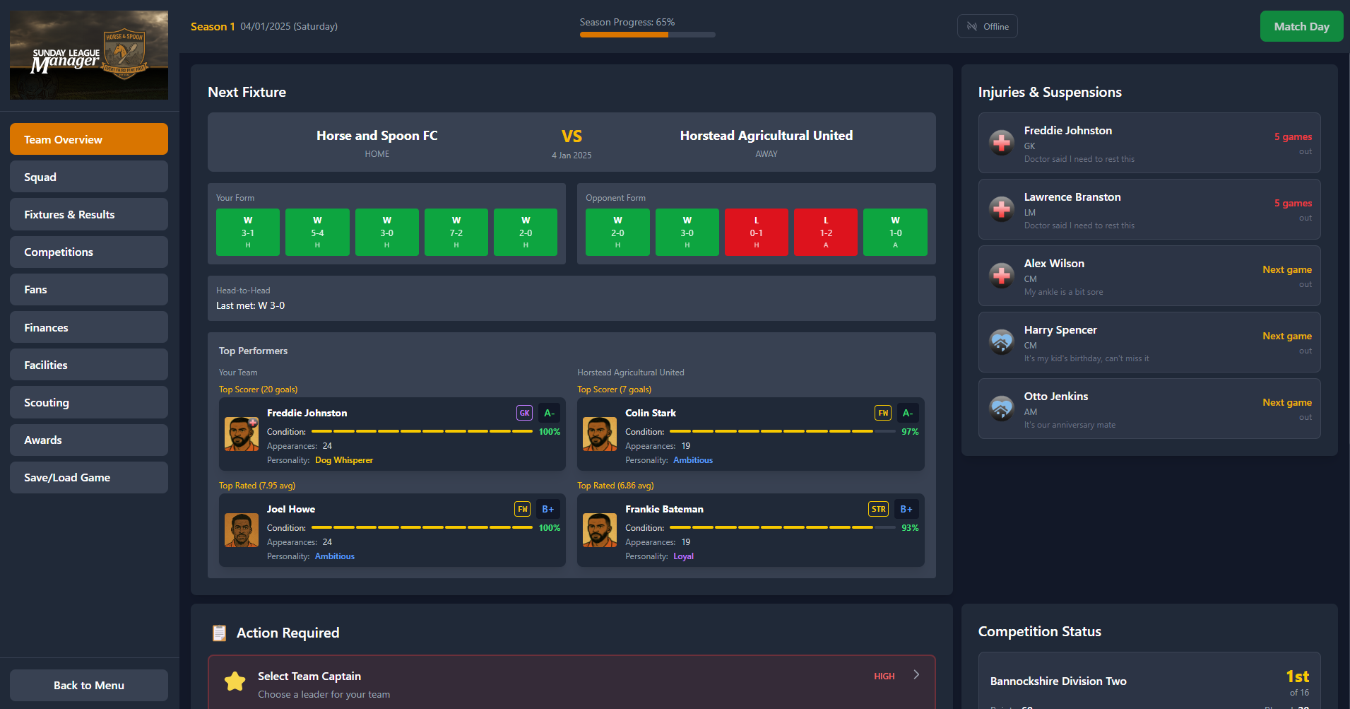 Another patch release, another tranche of nice to haves delivered for you all. Starting with a revamped Team Overview screen. Your injuries, suspensions and absences are visible in the new overview, as well as an Action section for any team actions required, your competition status will be here too and finally the new Message system where Terry - the landlord - and your players will reach out to ask about training they like the look of, players they can't stand and a bit more.