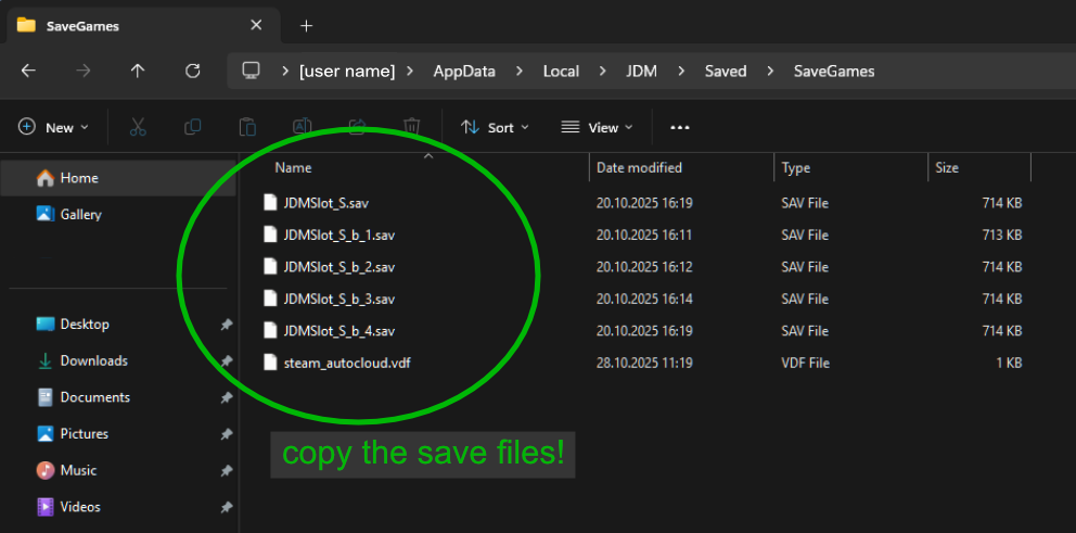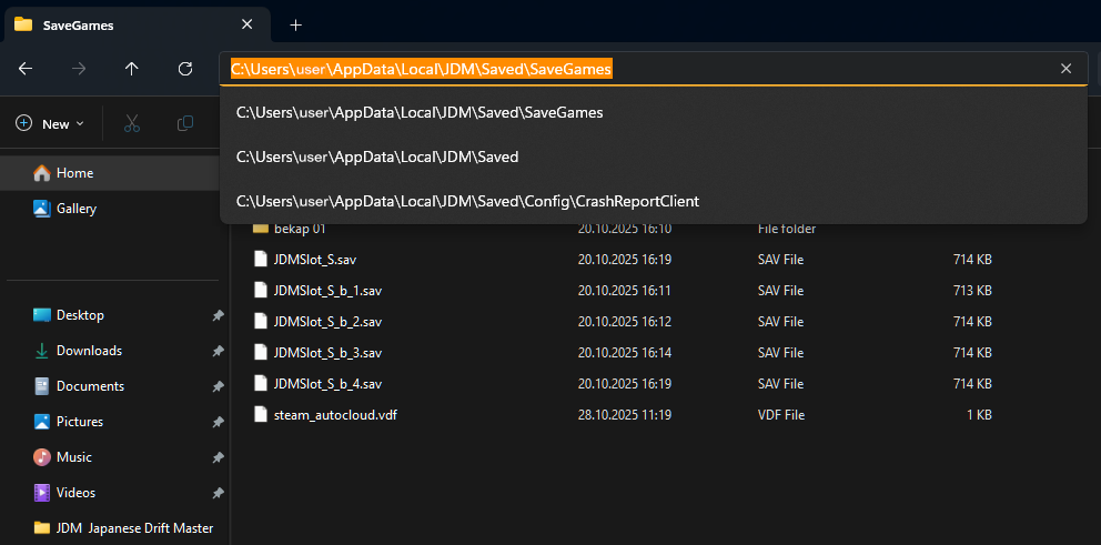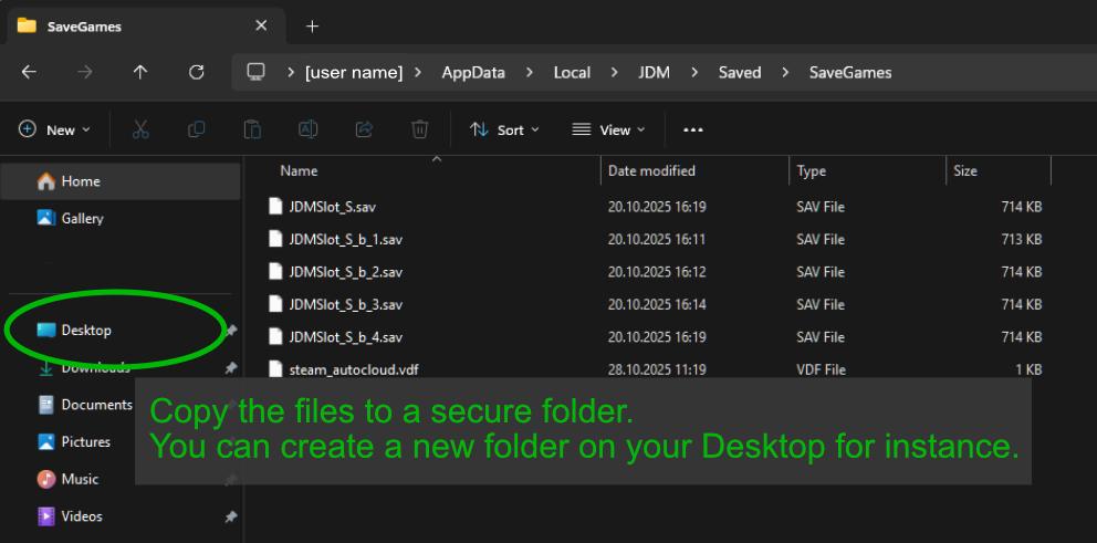 You will find your save files for JDM by following this path in your File Explorer: %localappdata%\\JDM\\Saved\\SaveGames (just paste the line into your file explorer and hit Enter). Please copy all of the save files into a different folder (ideally outside of the game folders, like to your desktop for instance)