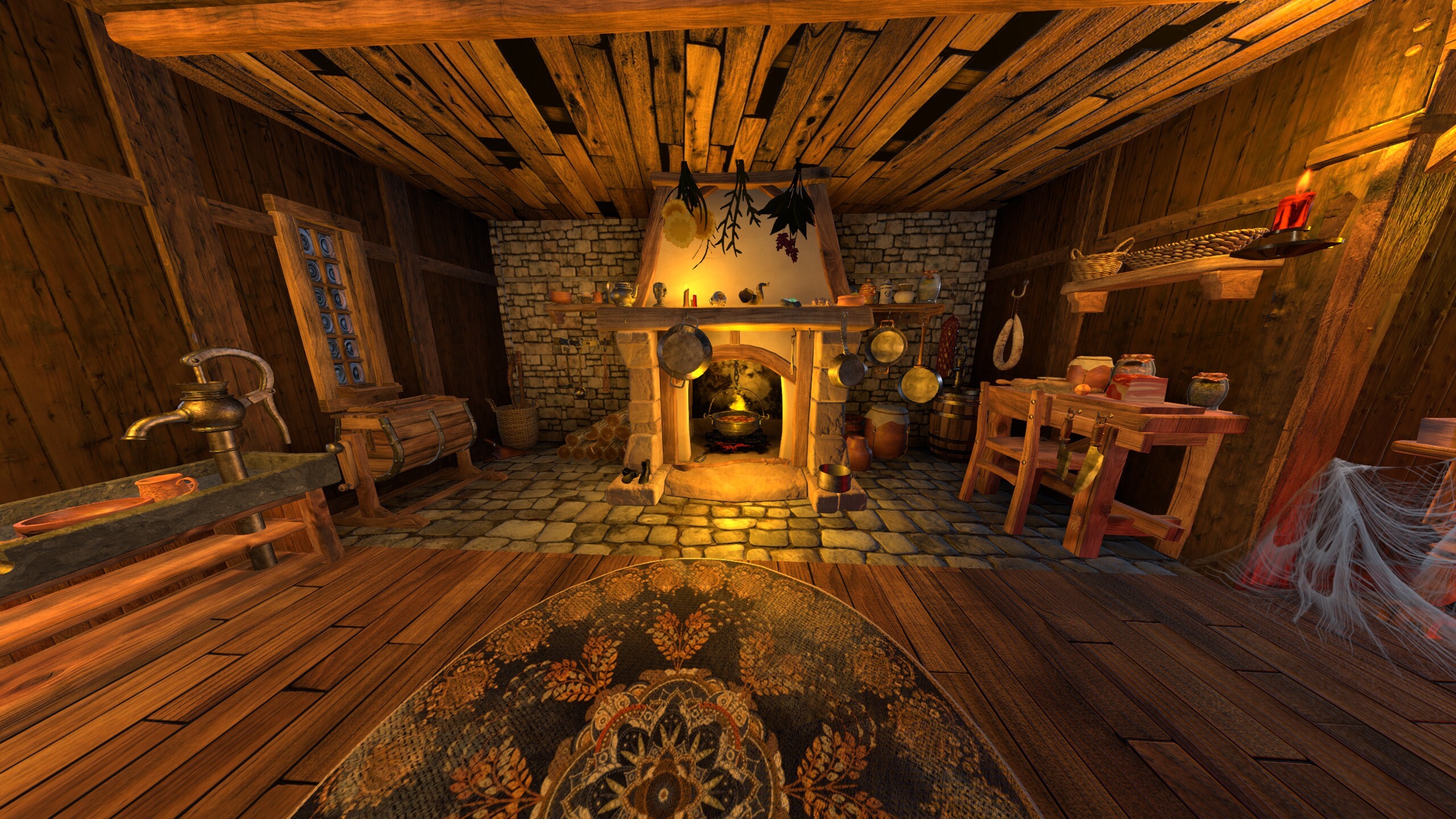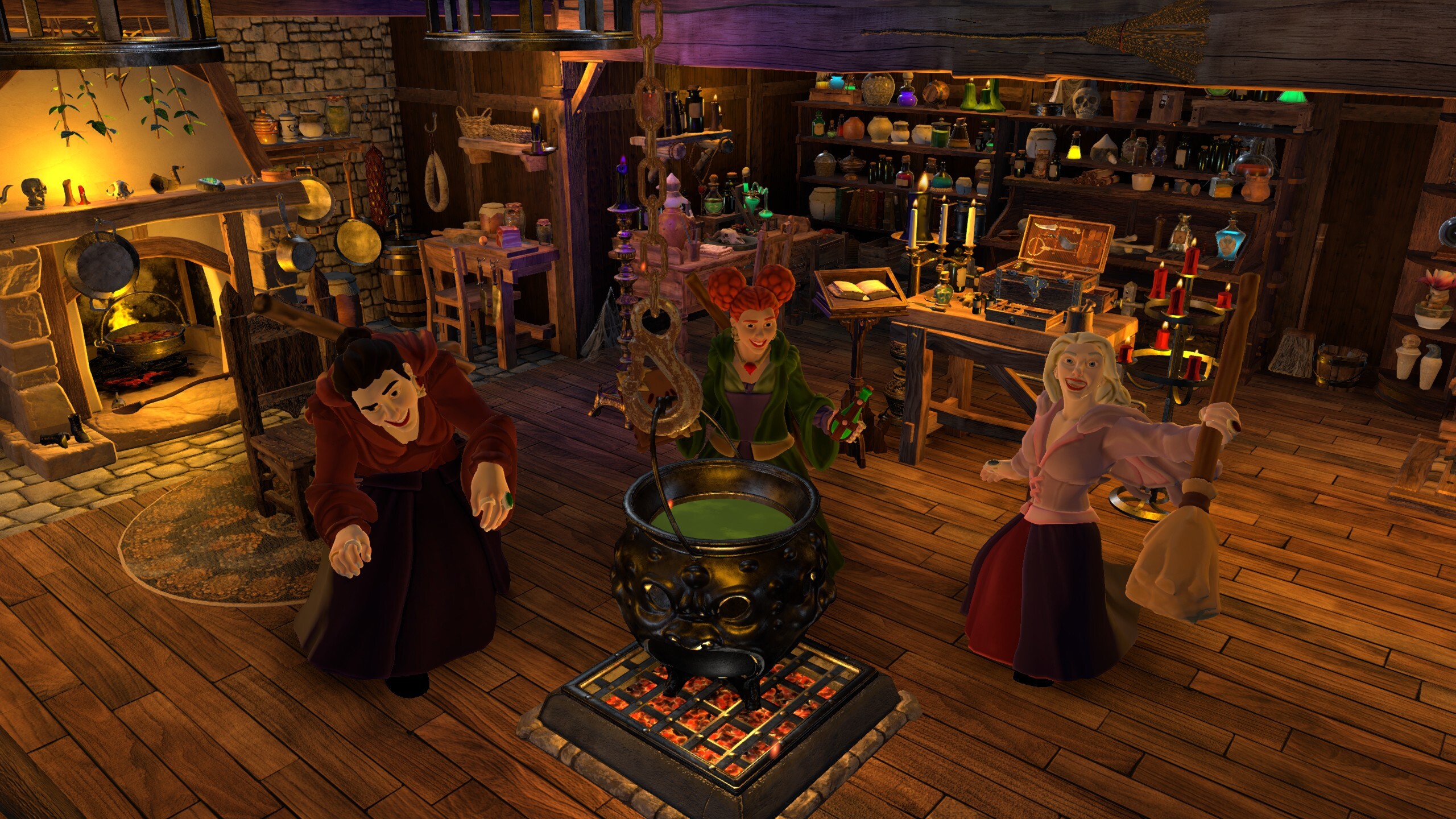 A spinning wheel sits idly in the corner, and potions fill the shelves.