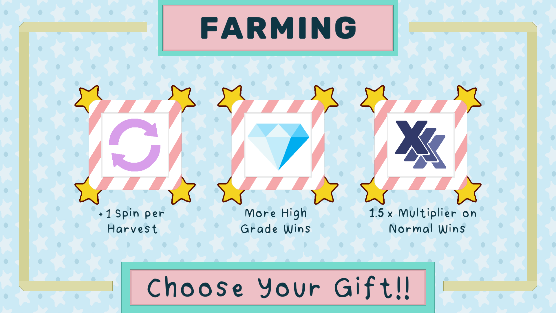 Here are the potential gifts you can get (independent of each slot type): 1 more spin per harvest or machine per day, a constant multiplier on normal wins (wins outside of multiplier mini-game wins), more high grade wins, more large fish size wins, and more rare wins.
