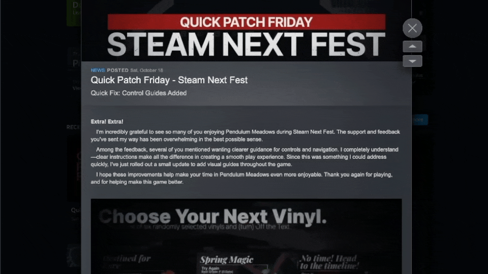 During Steam Next Fest, I received over 50 pieces of feedback through reviews, forums, and Discord - both positive impressions and suggestions for improvement. After removing duplicates, that's roughly 40 distinct feedback points. First and foremost, thank you to everyone who took the time to share their thoughts. I'm now working through each piece of feedback, carefully considering how to implement them while maintaining the game's core values and direction. Where possible, I'll incorporate all suggestions, adding extra layers of polish and detail to improve the experience. Stay tuned.