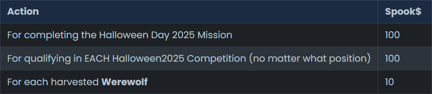 Qualifying in a competition awards 100 Spook$ for each comp. You don't need to place, just have an entry. Prizes for the competitions look like this: