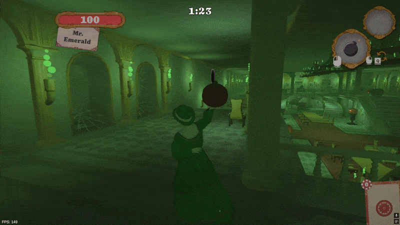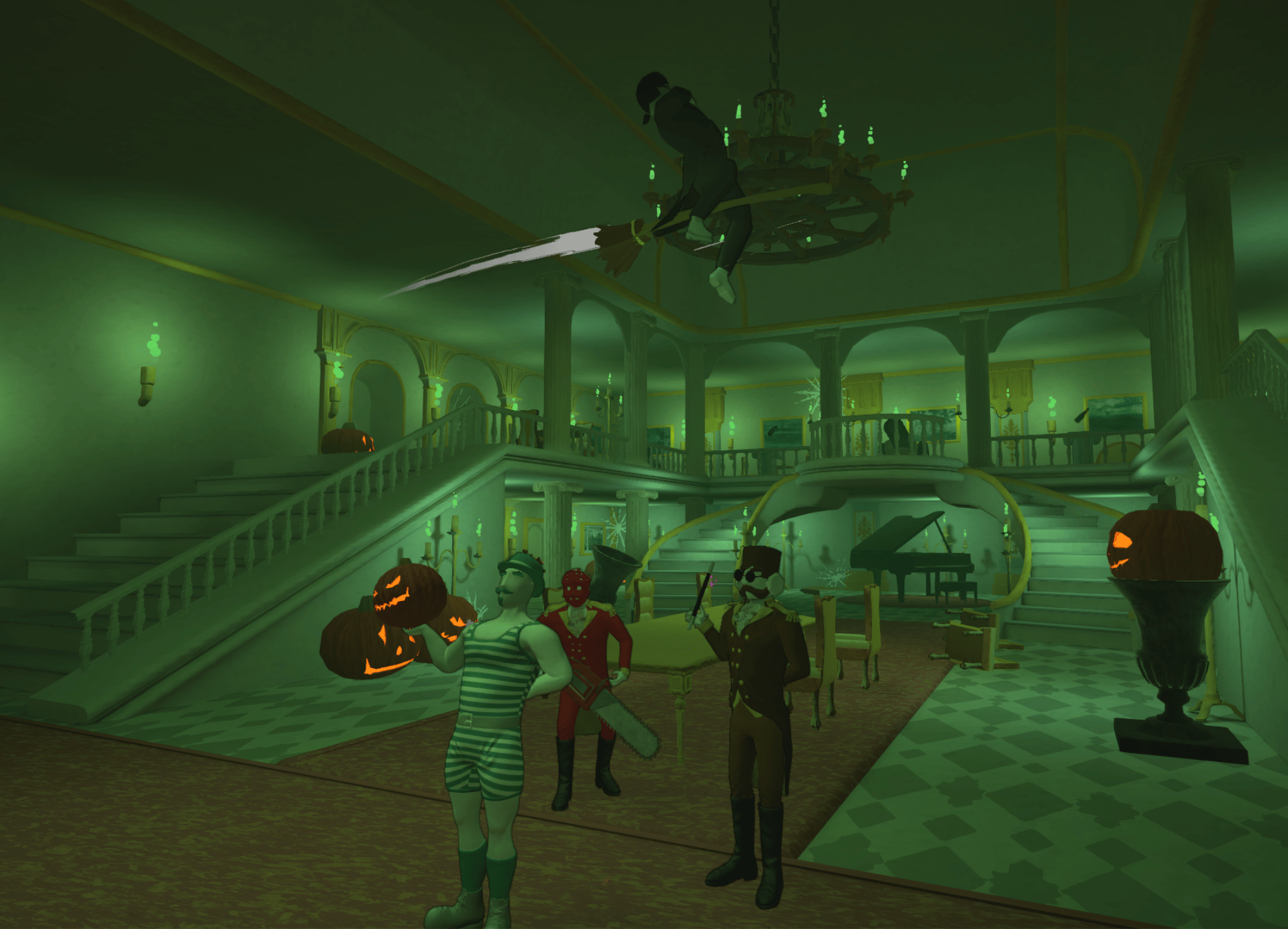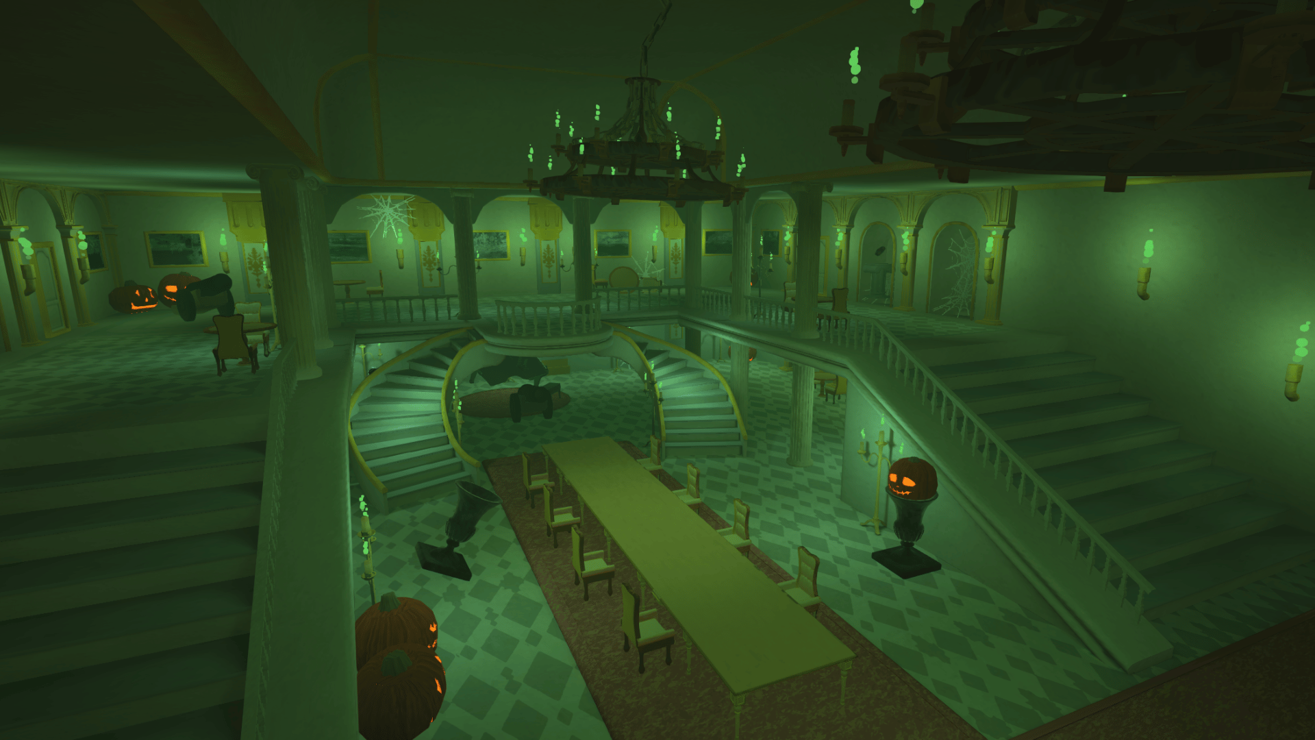 The classic brawling (for dispute resolution purposes, of course) map - the Ballroom - has been updated and made ghostly! Bath in eerie green candle lights and enjoy the good 'ol reliable stairs, tables, chairs, cannons, and grand pianos - all dressed up for the unearthly season.