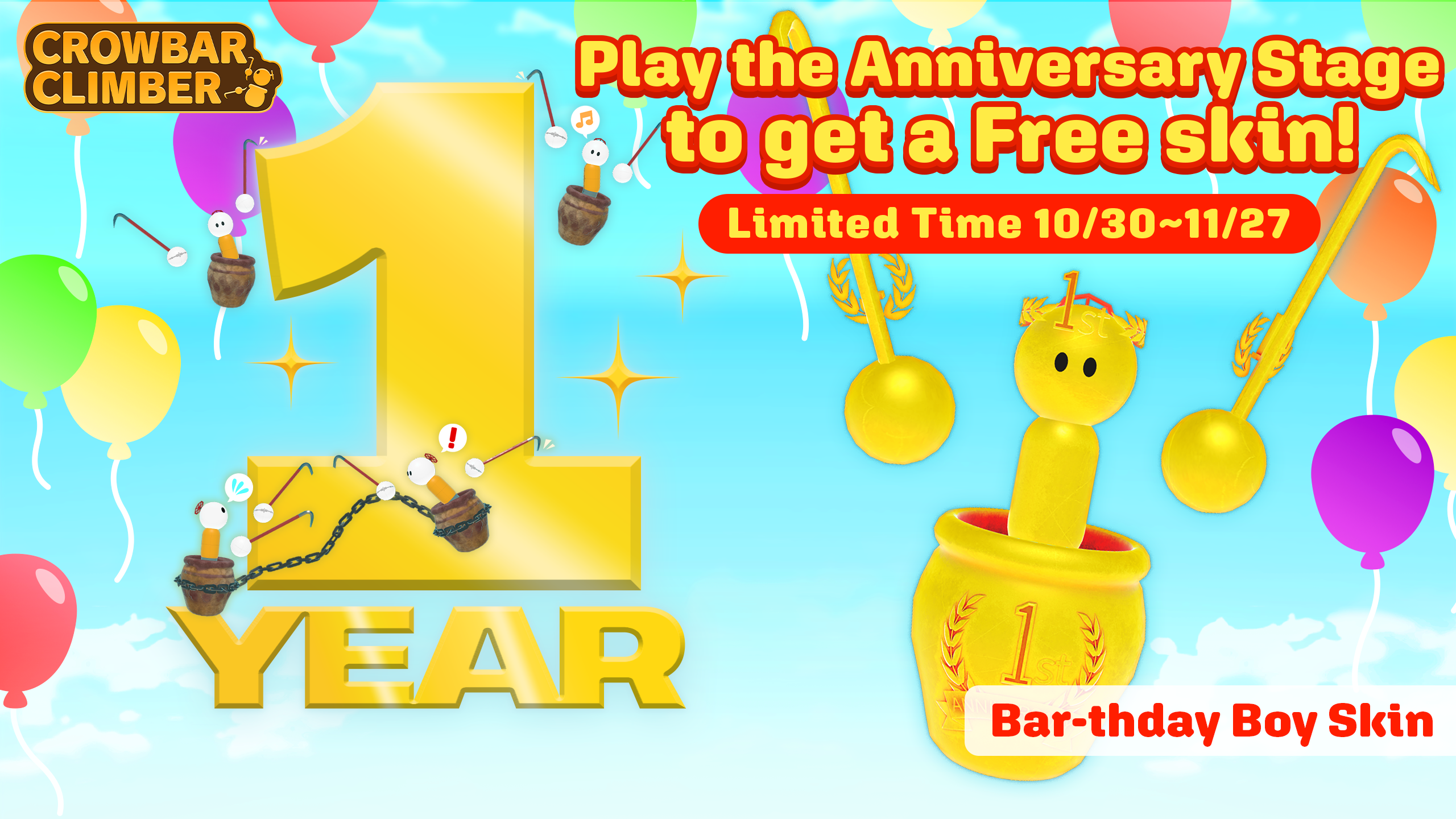 Take on the new celebratory 1st Anniversary Stage! It’s just a short climb to the top where you’ll be greeted with confetti, balloons, and a FREE SKIN!