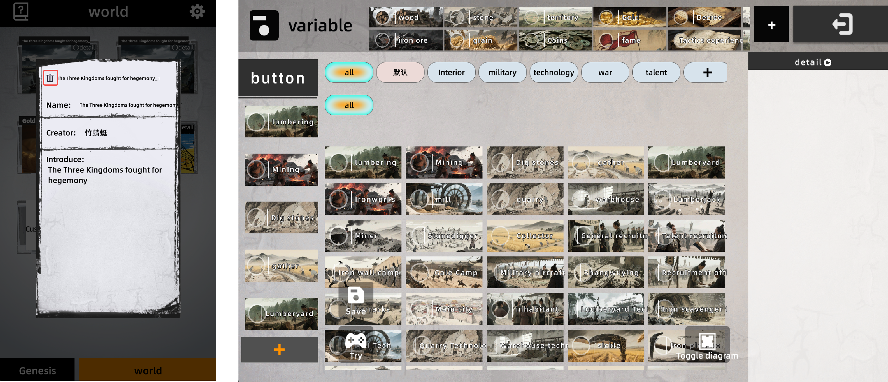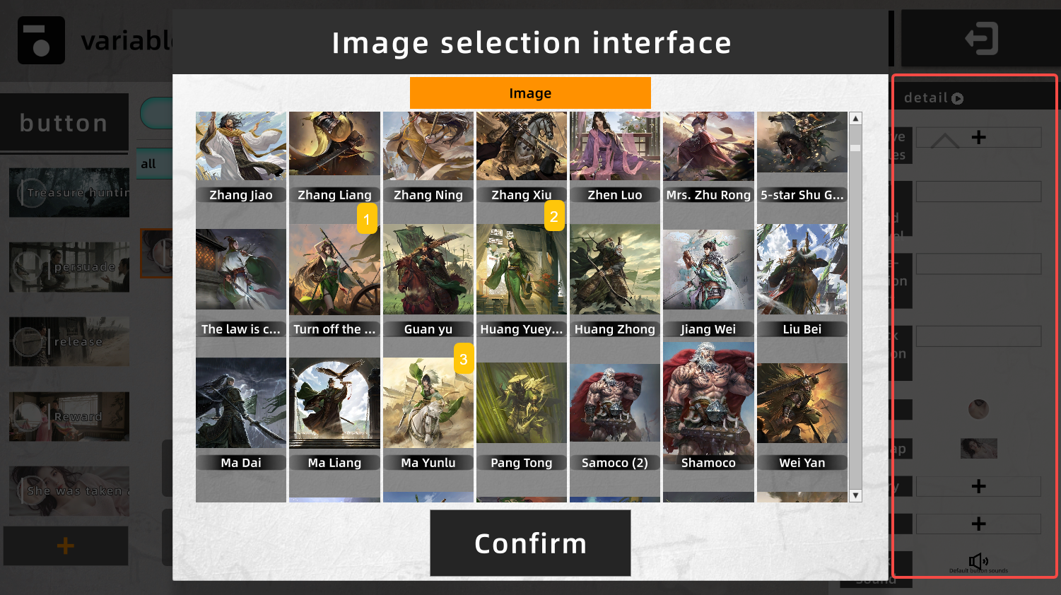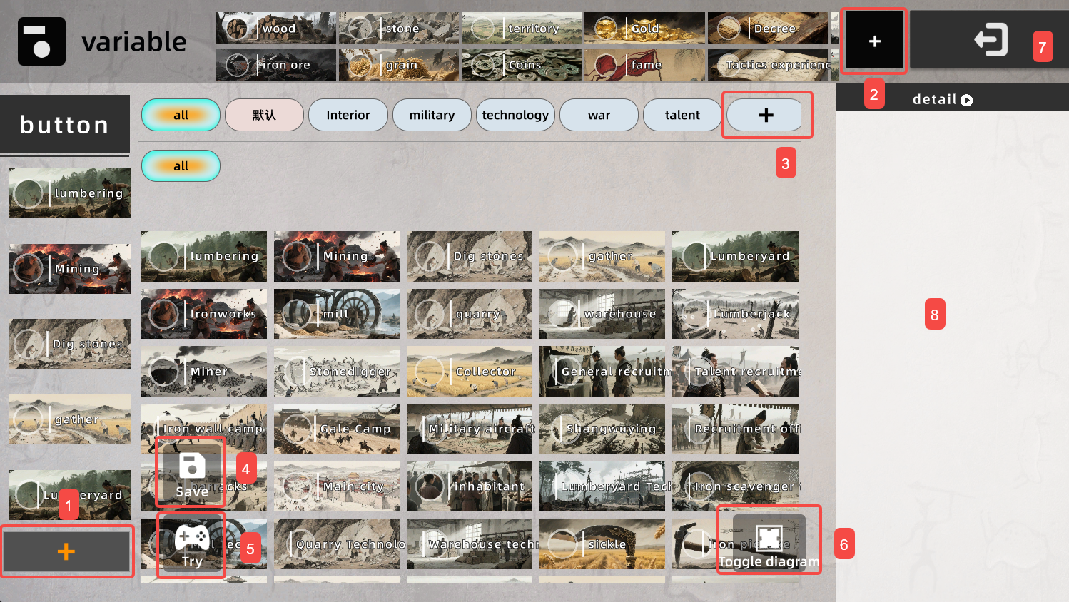 \[Details]: When a button is selected, shows all editable content and details. When a variable is selected, shows its editable content and details.