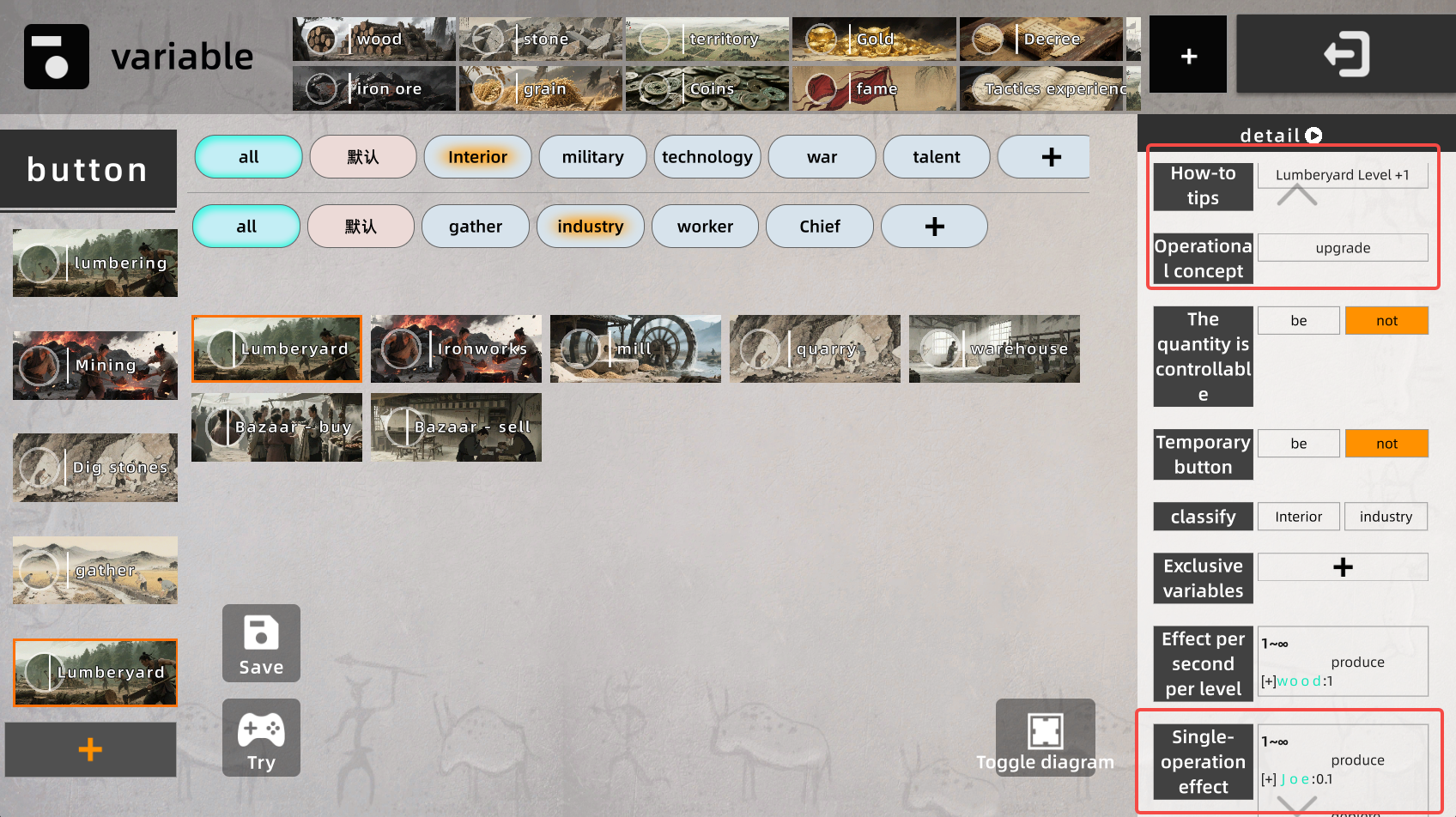 Click \[+] to add lumber camp, enter parameter \[-0.5].