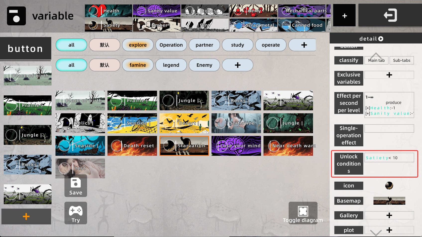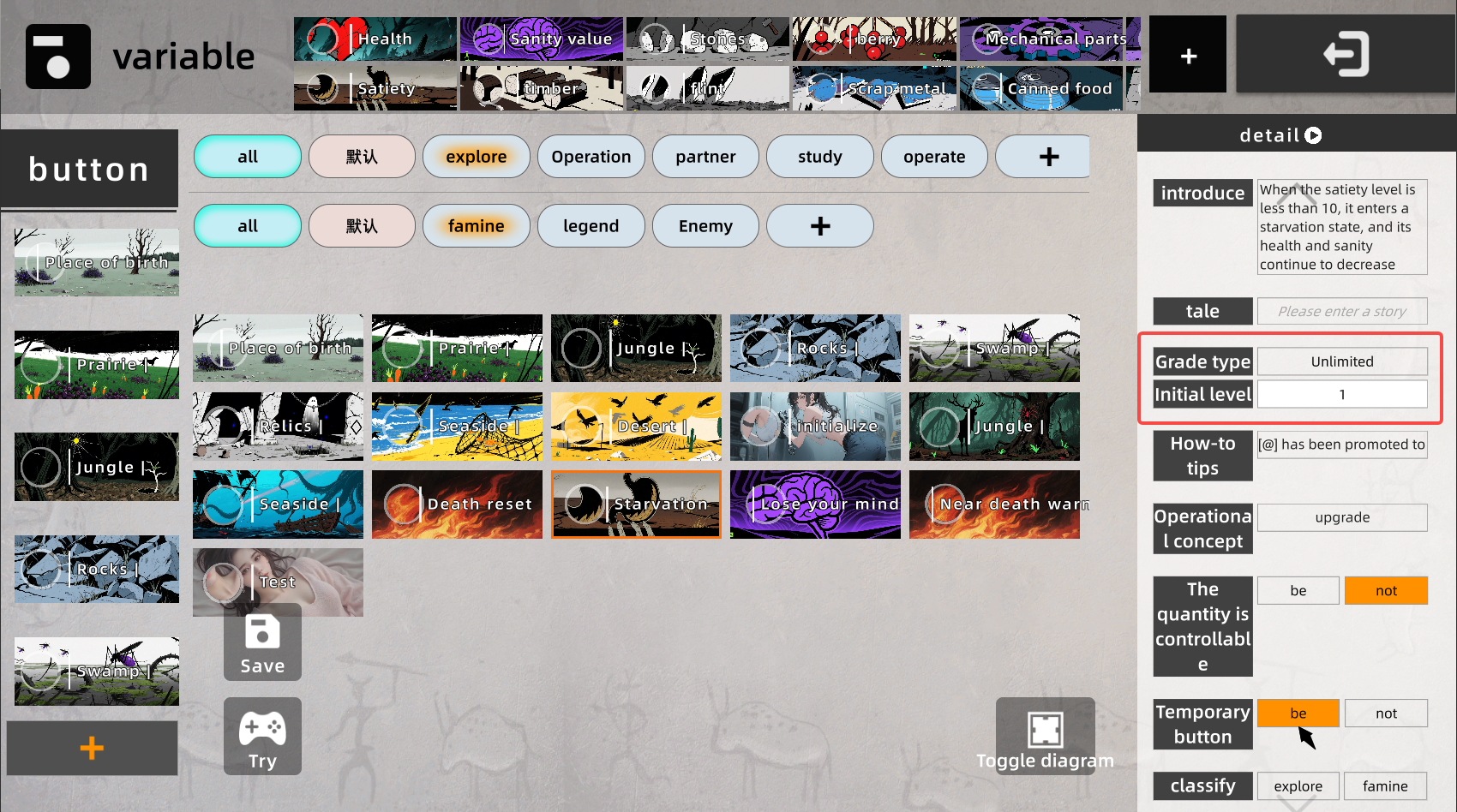 \[Toggle Relation Graph]: View other \[Buttons] and \[Variables] connected to the selected \[Button] or \[Variable].