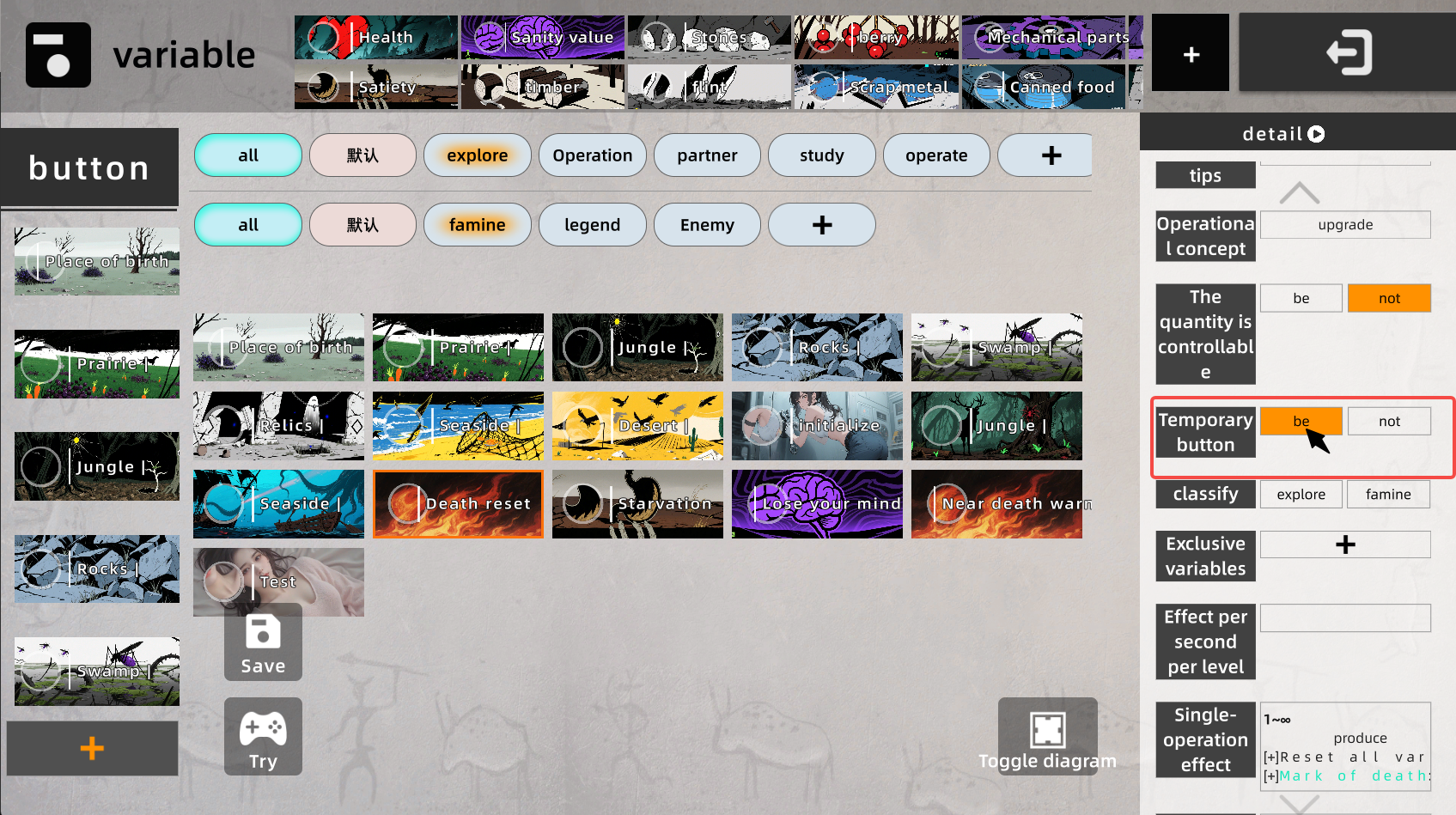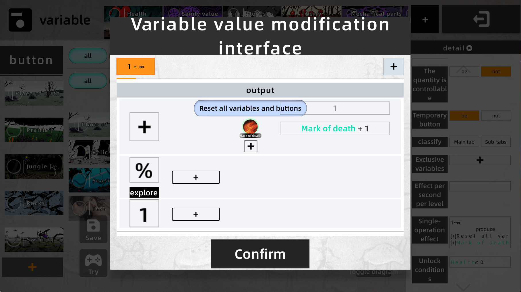 Reset Variable and Reset All can restart the world, achieving a “death & retry” effect.