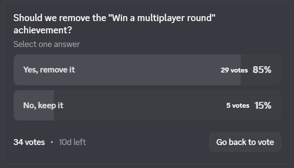 We did a poll on our Discord channel (join here) and majority of the votes wanted us to remove the achievement.