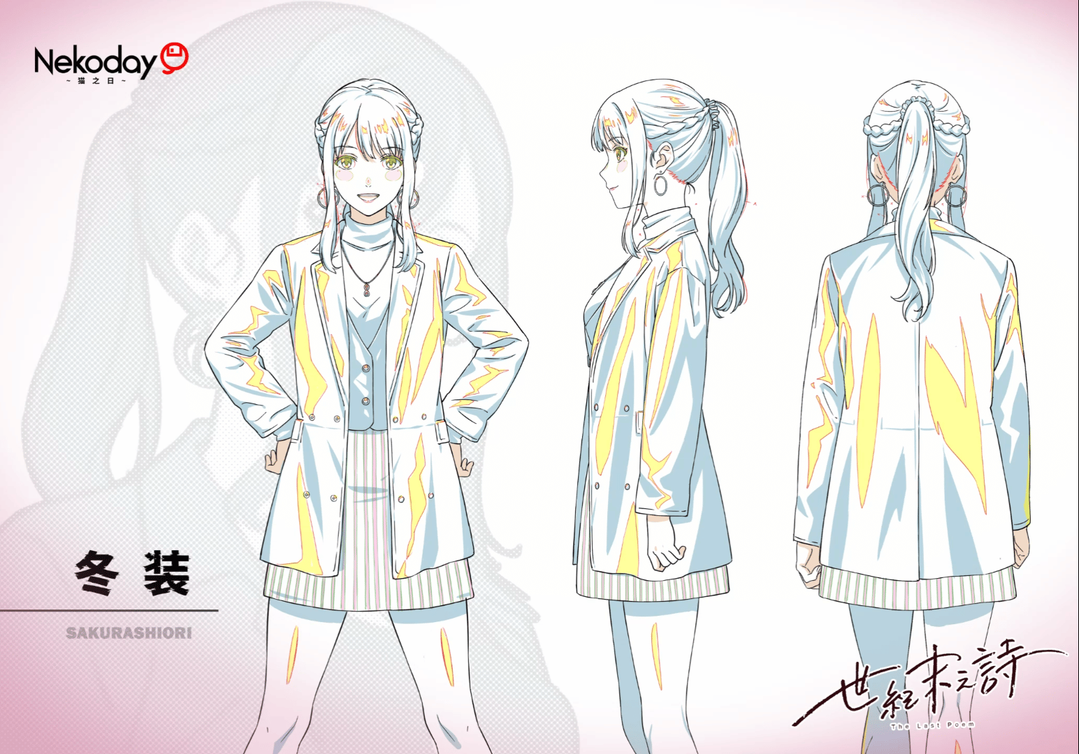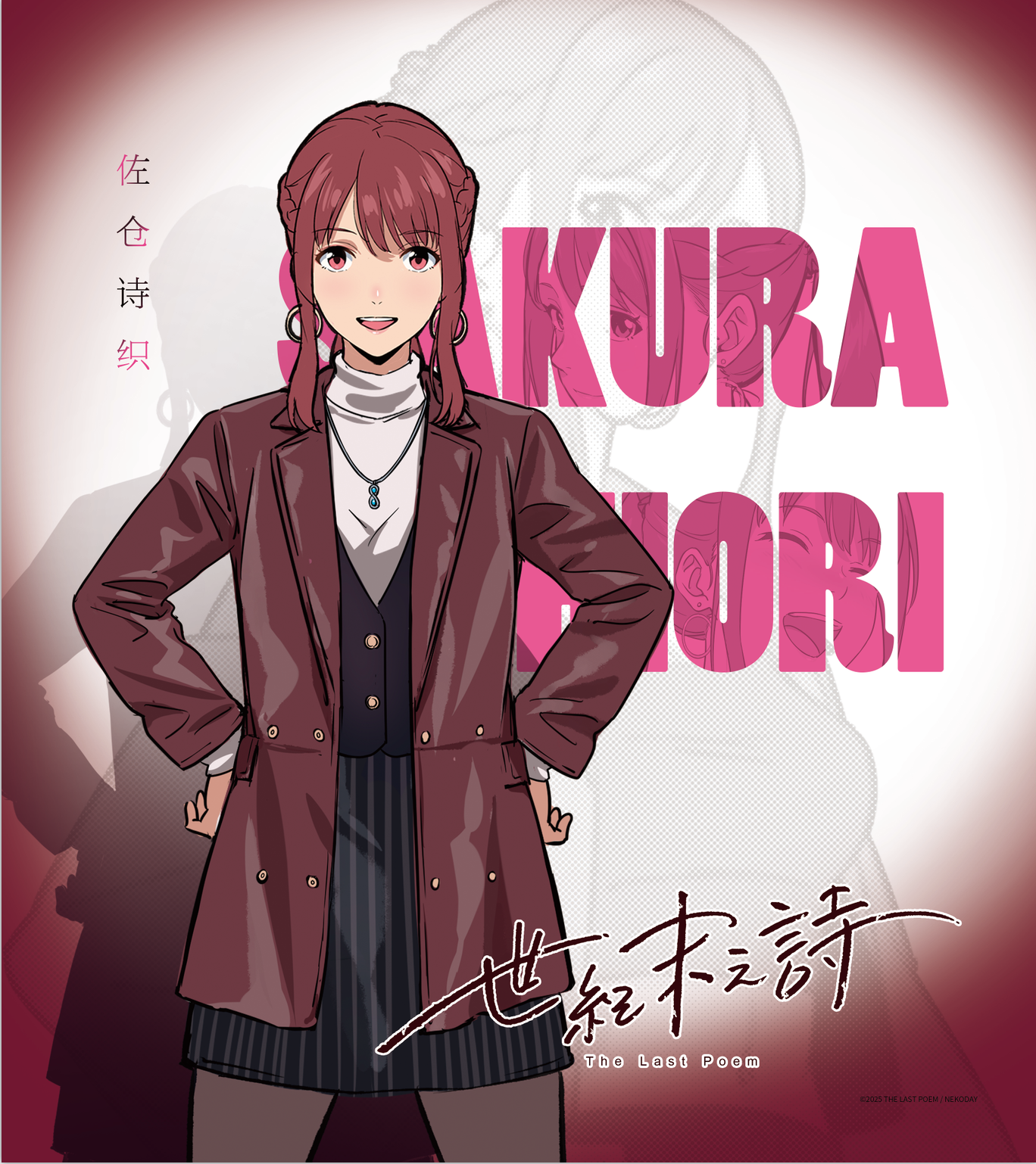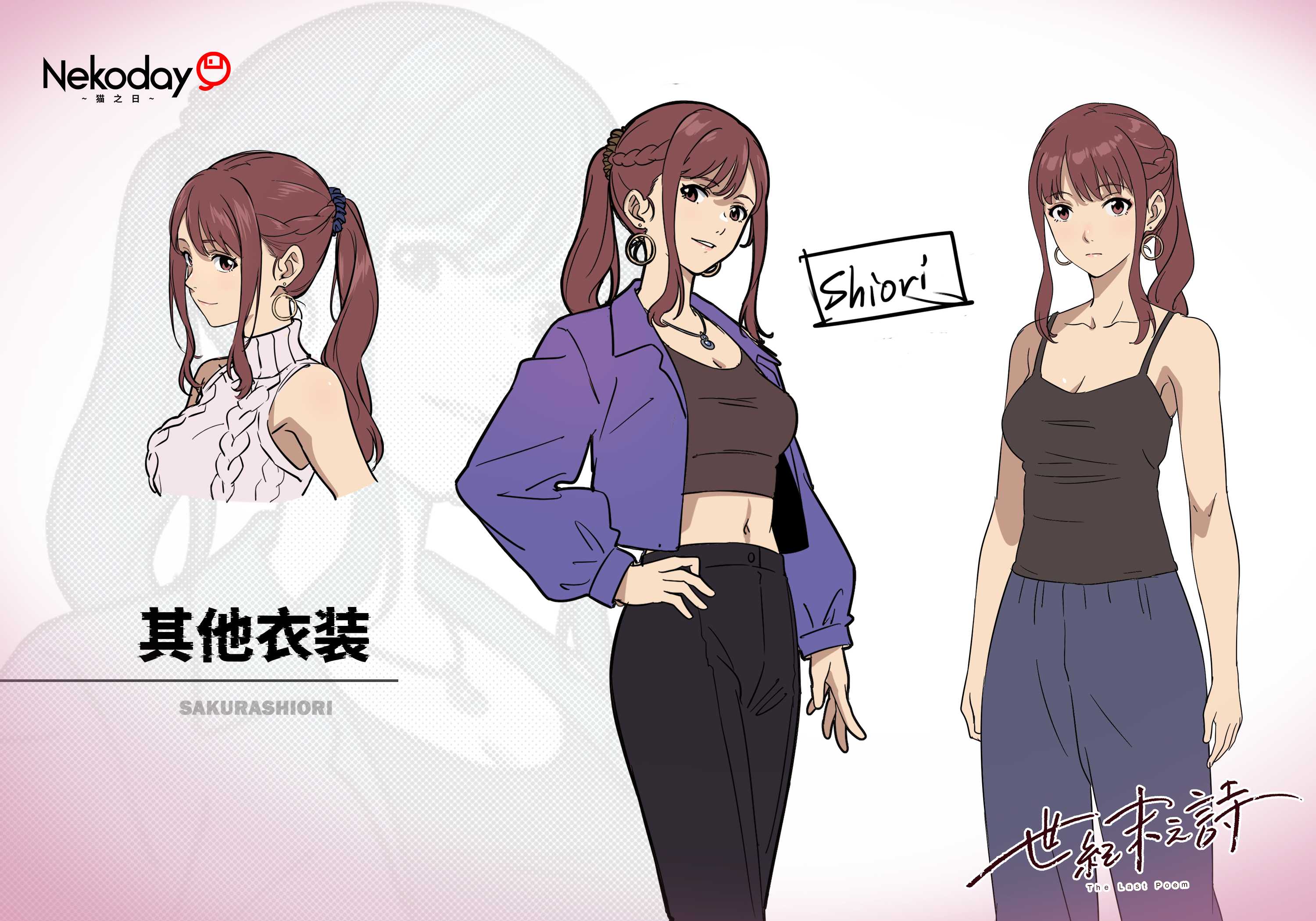 By 1999 in "The Last Poem", Shiori's hairstyle has changed from half-up twin tails to a single ponytail with braided elements. Her outfit centers around a burgundy long leather coat, paired with a combination of a turtleneck and a vest, bringing a retro revival feel. This layered design is both practical and fashionable, fitting the sharp office style while showcasing personality through accessories and vintage elements.