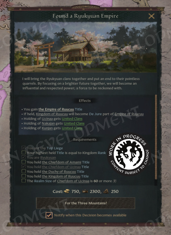 Besides updates from our artists, we also have some new bits of content. Below you can see a new decision to “Found a Ryukyuan Empire” which you’ll be able to try out in 1.18.1. For our world conquest enthusiasts, the decision to establish a Ryukyuan Empire presents a formidable challenge due to its Realm Size requirements. However, we all know this was your destiny to begin with if you choose to play as a Ryukyuan! You will also get to choose a family heirloom as a reward to solidify your achievement of showing the world the power of the Three Mountains.