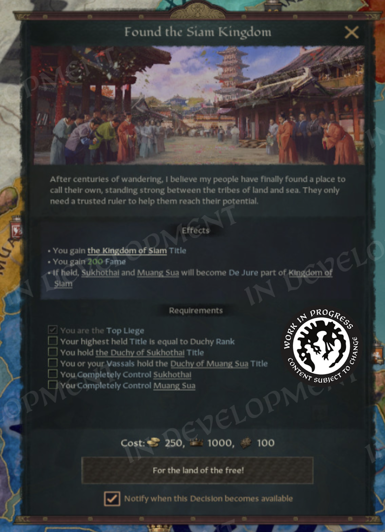 We’ve also added a decision to “Found the Siam Kingdom,” which is meant to represent the Tai people's ambition to unite under a single banner after their flight to the southern lands.