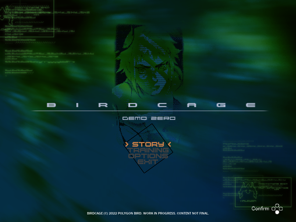 Early version of the -BIRDCAGE Demo Zero- title screen (late 2022).