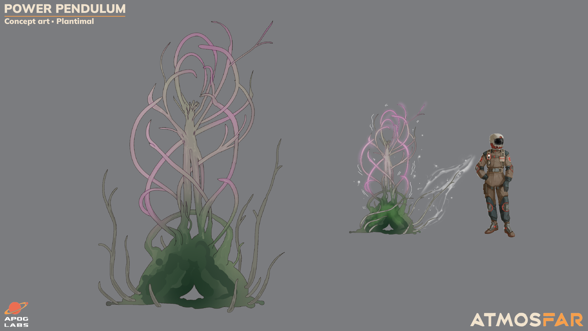 A plant that will offer you both is the Power Pendulum (working name). These plants have the remarkable ability to capture energy from the environment during the day, only to release it in the form of bio-luminescence and electric currents during the night. While photosynthesis does sustain them similarly to other plants, draining electrical current from nearby targets supercharges their growing mechanisms and gives it an evolutionary advantage. This means that you are able to siphon electricity from these plants during their active night cycle, should you be in need of charging your backpack, for example. However, if you get to close to them during daytime (i.e. when they’re collecting energy), your electrical equipment will get drained.