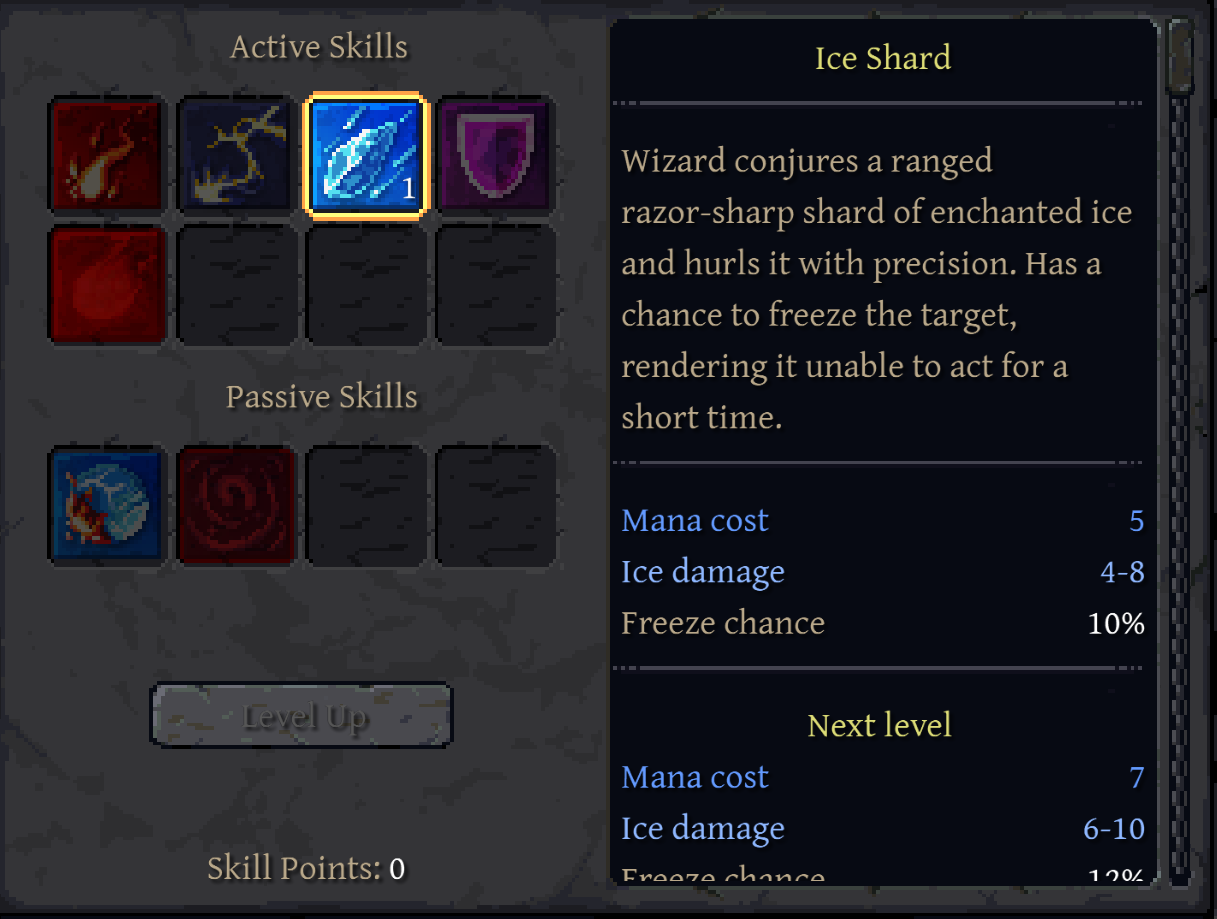 The system is simple: one skill point per level, and each skill can be leveled up to five times.