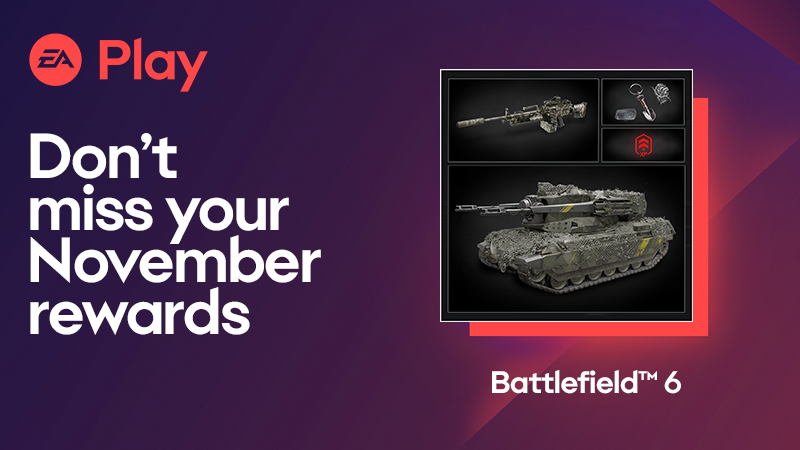 Get your Season 1 EA Play rewards now! Just launch Battlefield⢠6 from Oct 28-Jan 19, and claim your "Deadweight" Vehicle Skin, "Hazard" Weapon Package, "Take It In" Dog Tag, "Pumping Iron" Player Icon, "Buried Alive" Weapon Charm, and a S1 60-minute Battle Pass XP Boost in your in-game inbox.
