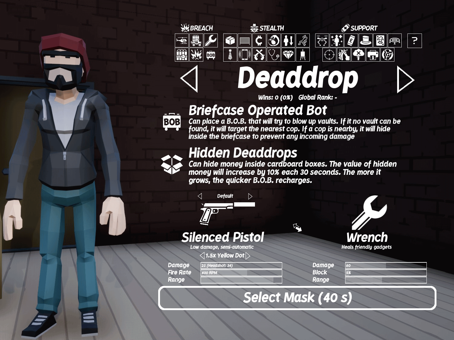This update also contains a brand-new robber class called Deaddrop. This breach class is currently only available when selecting the "Experimental" class pack and features a Briefcase Operated Bot, or BOB for short. BOB will drive towards the nearest vault to blow it up, and hide inside his briefcase if he gets spotted by a cop on the way there. While hiding inside his briefcase, he can't be damaged, forcing cops to break line of sight first to bait him out of hiding, before being able to shoot him.