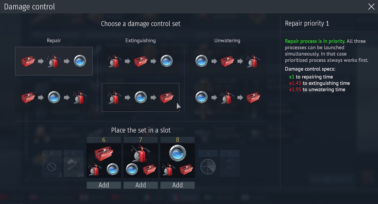 In the Spearhead major update, we’ll be introducing a new Damage Control (DC) mechanic for every naval vessel in the game. In this updated form of damage control, you’ll be able to pre-select three different action presets that replace the basic manual repairs: firefighting, module repair, and water pumping. After receiving damage, all three DC processes begin automatically, and you can adjust the priority of which area you want to focus on. The manual quick repair is no longer needed, as the repairs will always be carried out automatically by the crew as long as it’s possible to do so.