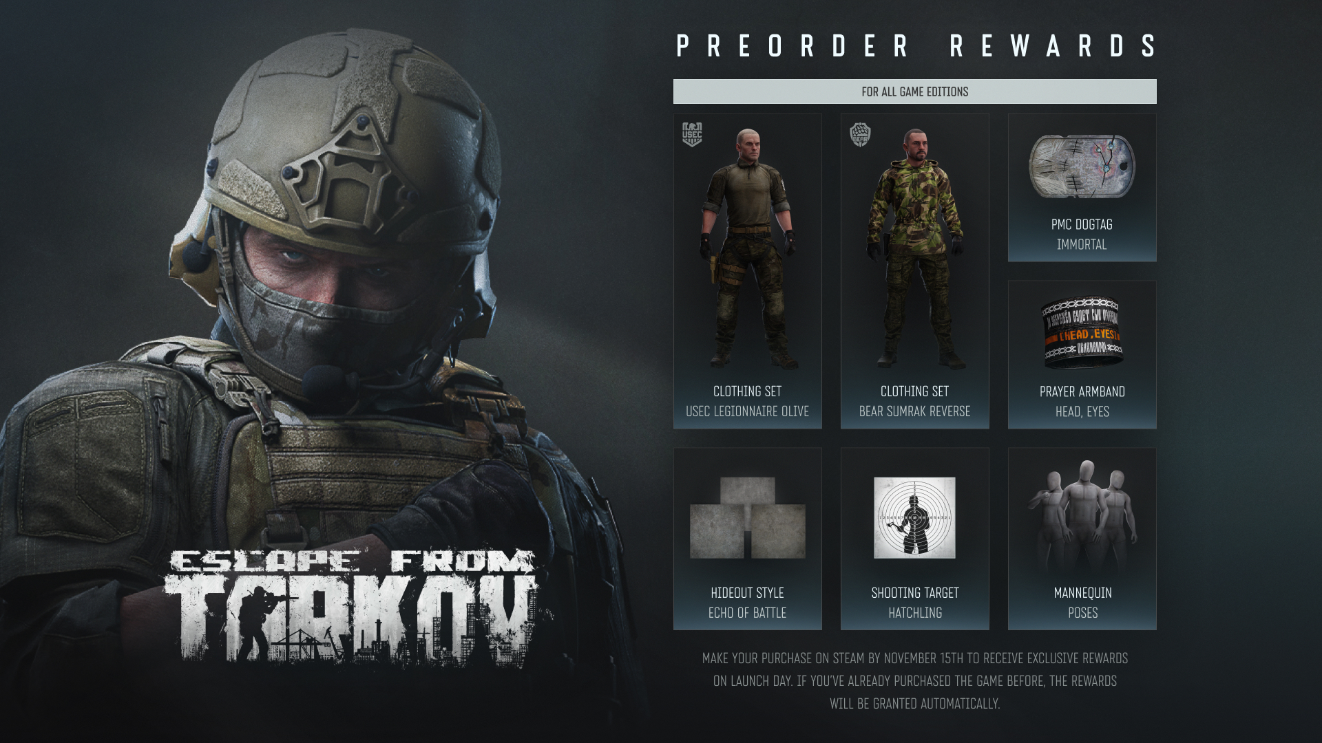 We also want to confirm that all specific release bonuses will be available for Steam players as well upon the game’s launch. Make your purchase by November 15 and create an account in Battlestate Games Account Center to receive all exclusive rewards on launch day.