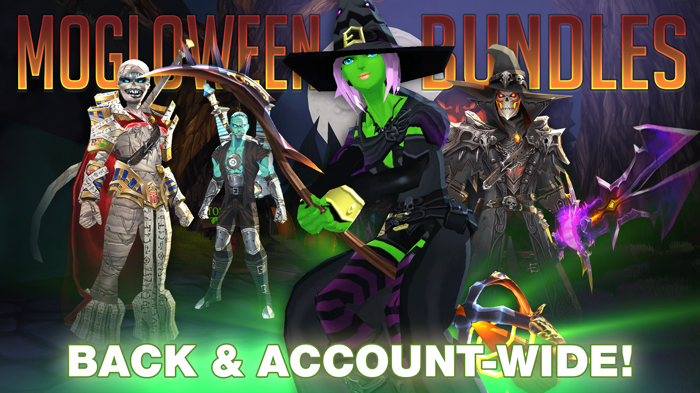 Past Mogloween bundles are back and now unlock across your entire account. If you already own one, every character you play can enjoy the spooky rewards!