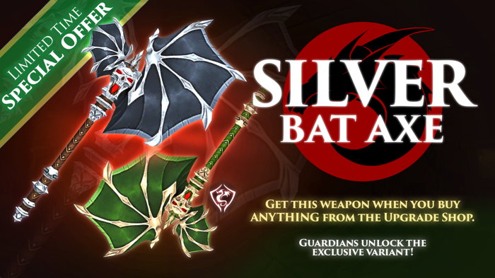 The new promo item is the Silver Bat Axe. And it's yours with any purchase, from Dragon Crystals to Guardian upgrades. Guardians also receive a themed Guardian’s Bat Axe plus a decorative house display, but act fast because it disappears when November begins!