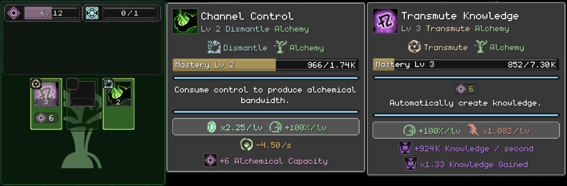 But Alchemy is still alluding me a bit. Back in original design I had for this game, Alchemy WAS passive resource generation. But since Auras + Generators exist now, passive generation is no longer a niche thing, so Alchemy is missing a lot of its uniqueness. In v0.6 I kind of went with "mechanical complexity" as its unique trait, but honestly, that doesn't work that well.