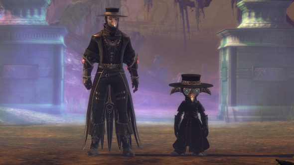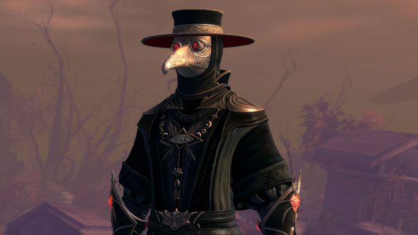 Dress up as a symbol of death from ancient times. The old practitioners of the medical arts carried the dead across waters infested by Zhaitan's undead stench. It is said the beaks on these intricate masks smell of a lovely fragrance, a stark contrast to their ill-fated presence. The Vigilant Physician's Mask Skin is available for 400 gems.