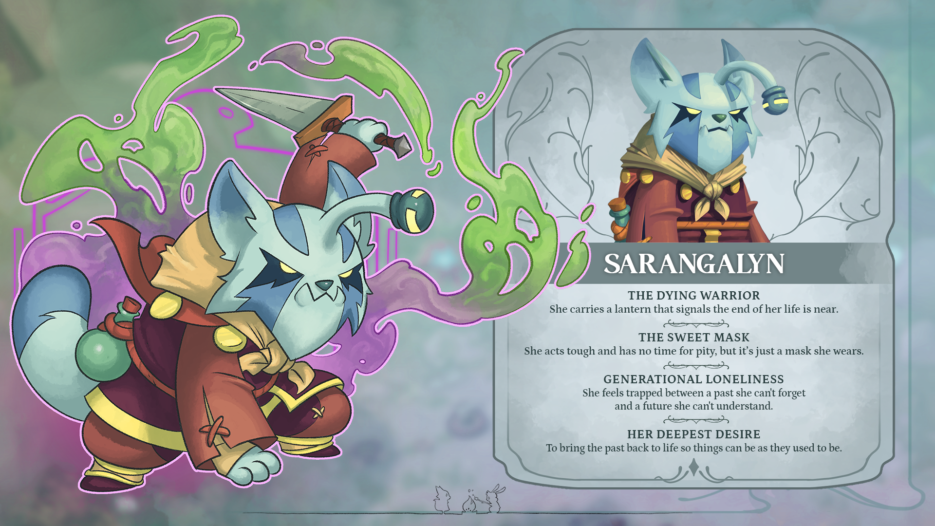 Sarangalyn is an old witch, a warrior whose end is near. A tough cookie on the outside, she’s quite soft on the inside – mentally and physically! She’s a ranged magic user who poisons enemies and helps reduce party cooldowns.