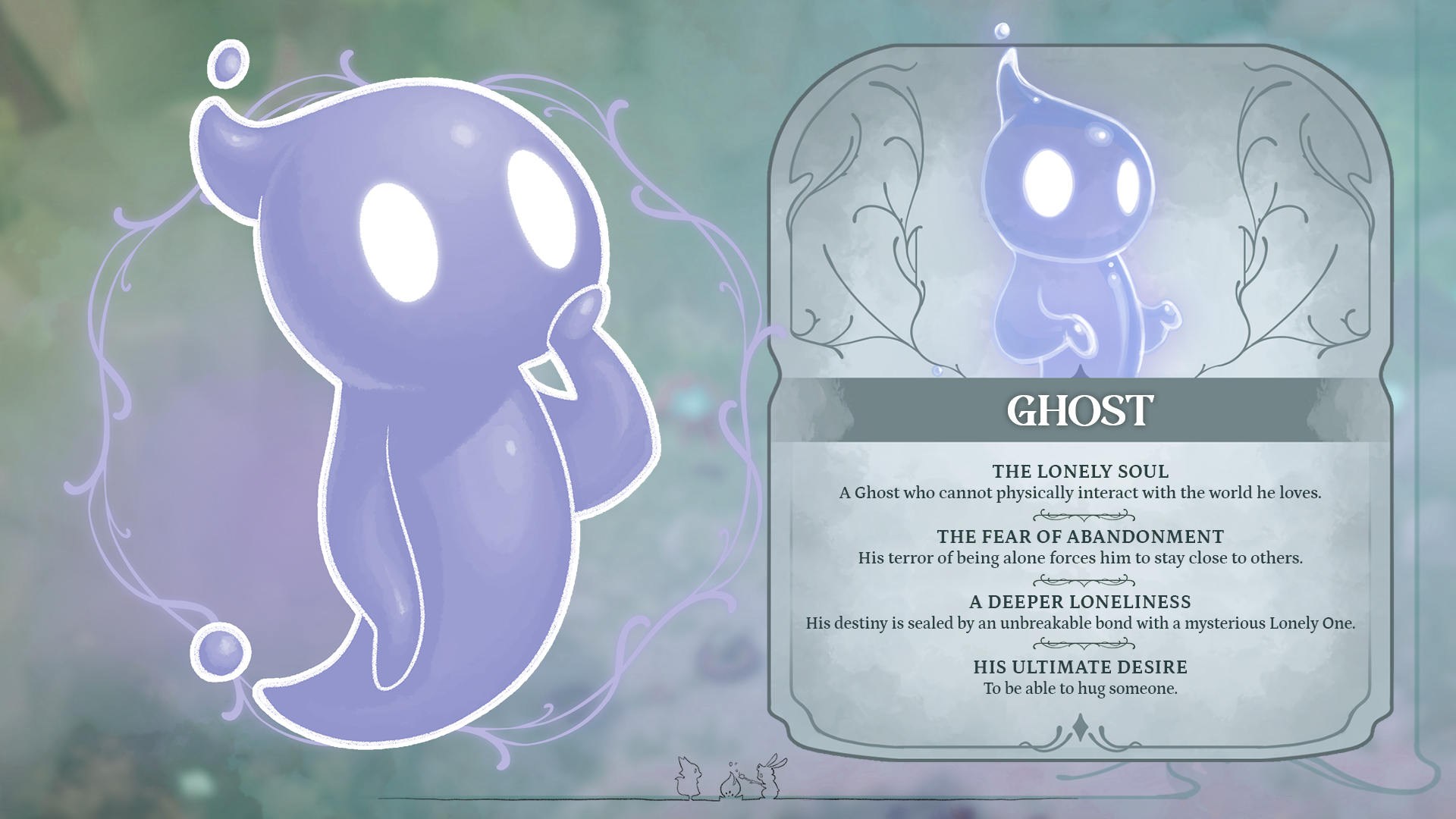 A lonely Ghost wakes up at the start of The Lonesome Guild with no memories. He can’t physically interact with anybody, but he can possess (in a friendly way!) them to make them stronger and imbue them with his Ghost Power.