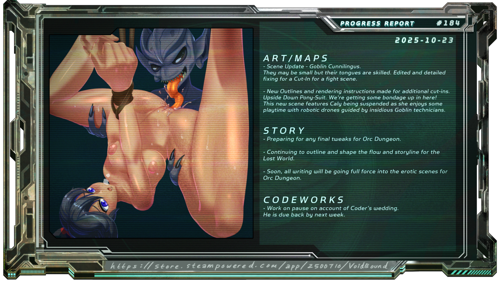 Goblins may be small, but they’ve certainly got some surprising skill. The team’s been busy editing and detailing a new cunnilingus cut-in for an upcoming fight scene.