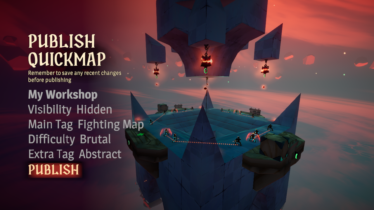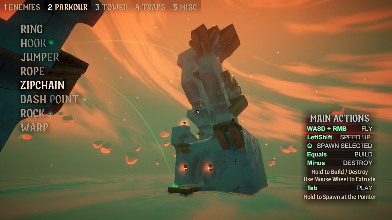 We will have our own Shady Level Editor - Quickmap, it is a simple in-game tool for custom maps that doesn't require special skills, you can jump in at any time to quickly build a tower, experiment with various platformables (zip-chains, ropes, grapple points, etc.), place enemies and instantly test your creation.