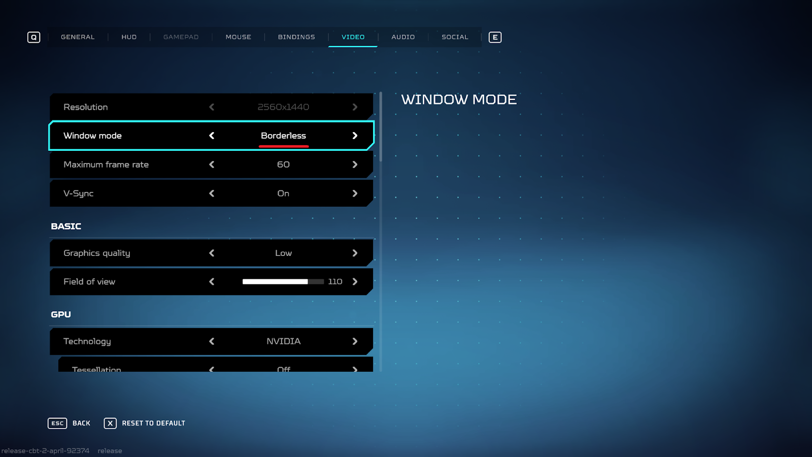 2. Go to the main menu (by clicking Esc), then go to settings and pick the Video tab above. Set the window mode setting to “borderless”.