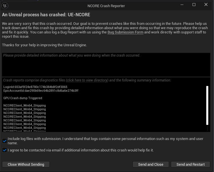 If the game client crashes or an error window, like the one below, pops up, please click Send and Restart and send the NCORE.log file to the support. It’s located in this directory: %LocalAppData%\\NCORE\\Saved\\Logs.