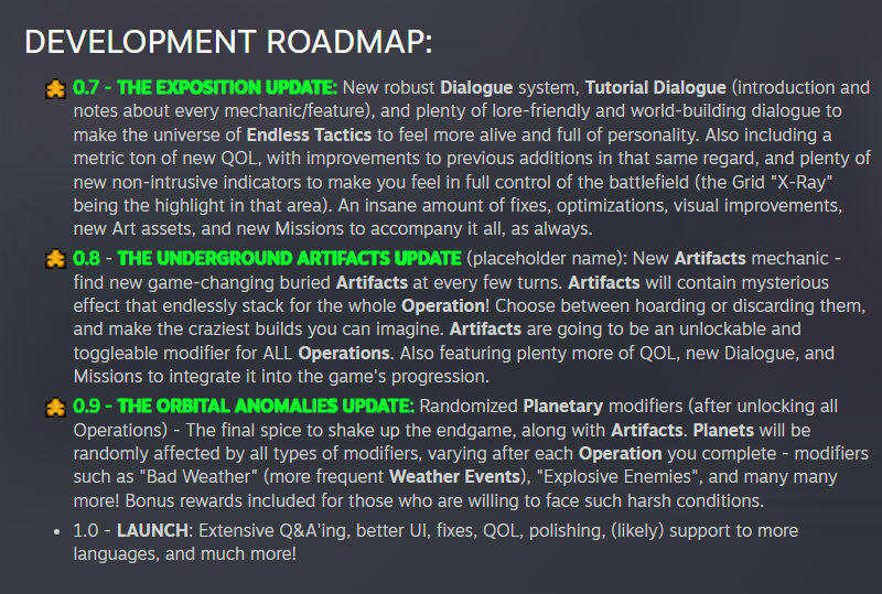 So... This was the old Roadmap - and yeah, it's fairly modest by comparison to what we have now, to say the least. Beyond that, many major features were added such as Turrets, Proc-gen (for maps), Artifact Anomalies, Custom Artifacts Mode, Apex Waves (Apex Units & Nest), Unit Ascension, the Codex, Online Leaderboards, and many others still! This of course was not just scope creep for the sake of scope creep, but rather things I thought were integral enough to be added before full release, due to how our playtests went at the time, via feedback given via our FORMS, REDDIT, DISCORD, and alike. I simply could not see Endless Tactics anymore as a full experience without our beloved Apex Units, which essentially act as periodical posses to the endless-type horde mode it is - Units that are unique to each Planet, and by the way are fully playable via Artifacts, certain Upgrades, and other late-game combinations.