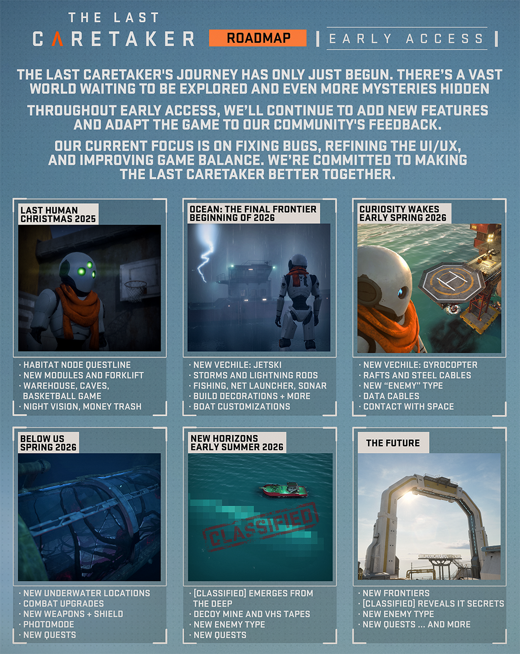 We want to thank you so much for all your support and feedback up to this point and we’re truly excited for the journey ahead of us. We hope you’ll join us, and continue to provide incredible feedback as we expand this vast ocean world with more vehicles, items, systems and more. Check out our early access roadmap for more detail: