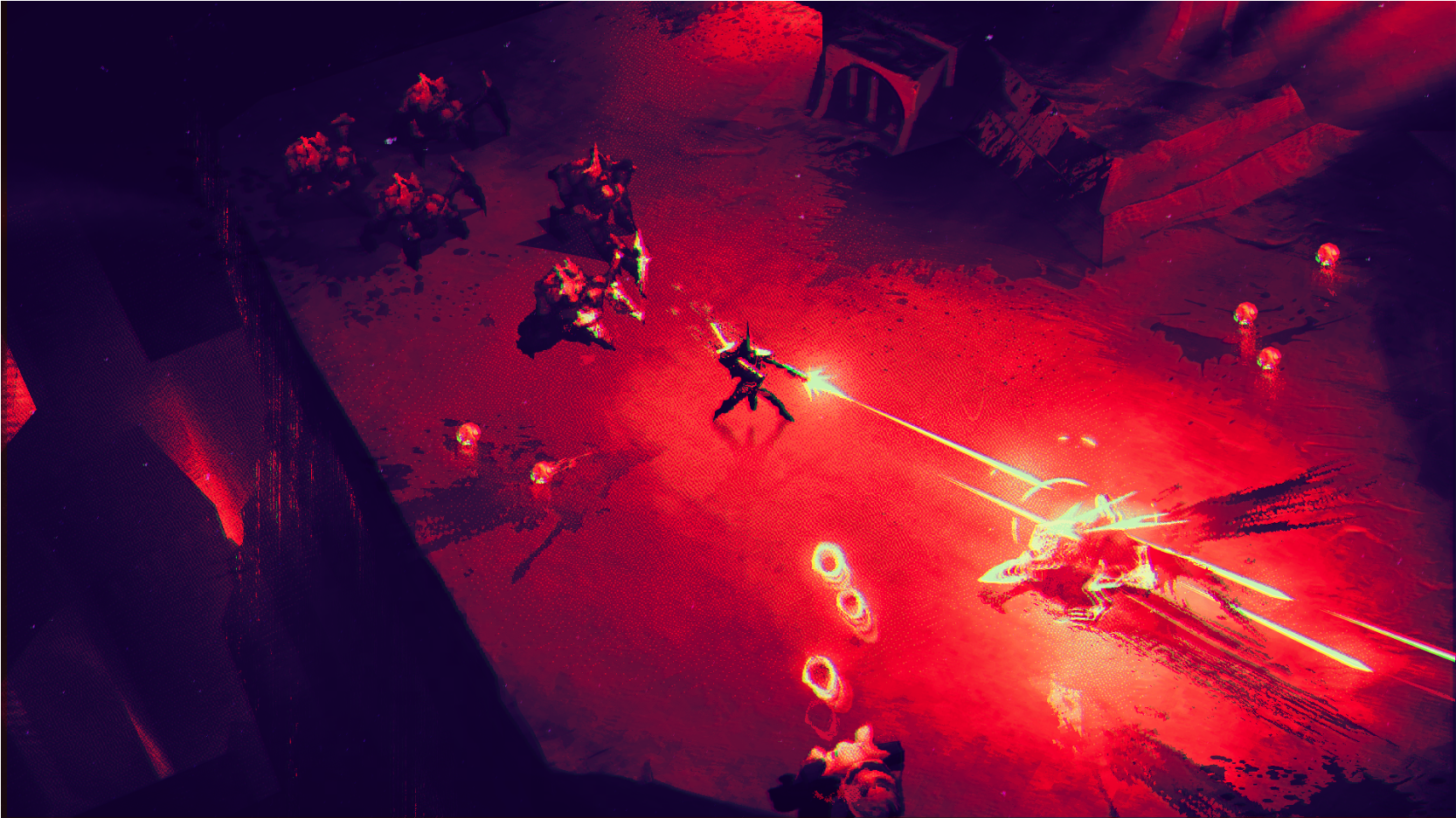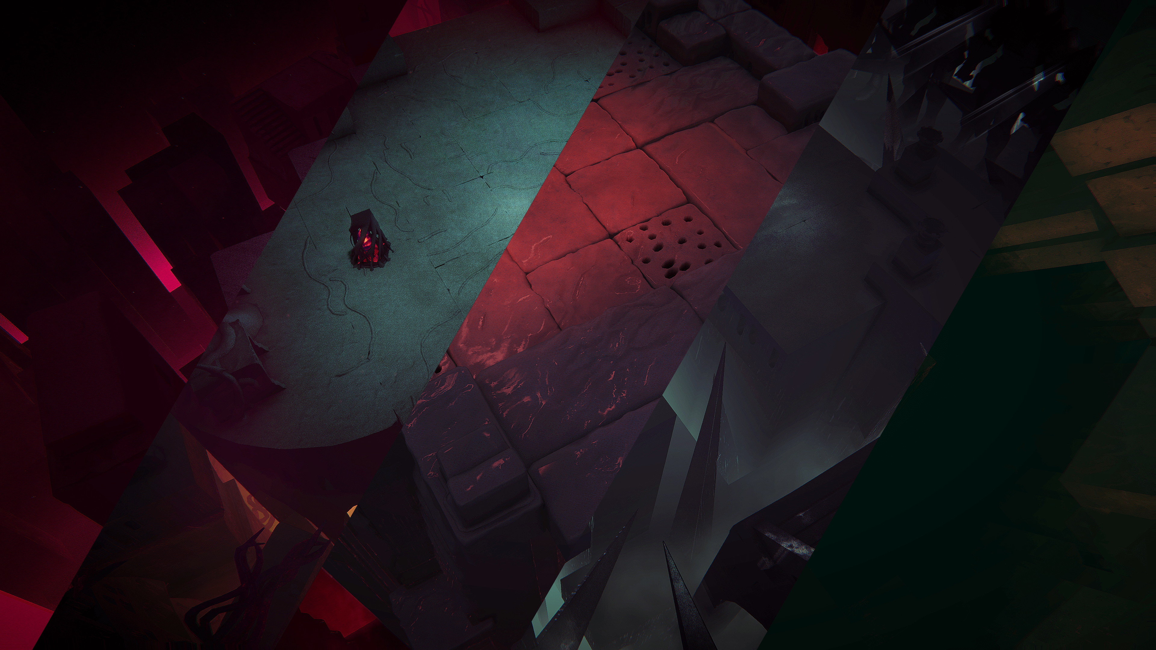 Abyssal brutalist architecture, crunchy retro pixel textures, grungy noise, non-Euclidean geometry, cryptic minimalism, and liminal spaces were all explored in isolation. The color palette, VFX, lighting, and arena design were carefully considered, then workshopped with the team until they coalesced into a unified, distinct visual style. From centered lighting on arenas to subtle background illumination and fog, every choice became a building block for the rest of the world.