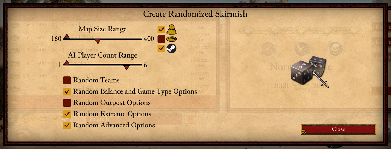 Want to leave your fate in the hands of the dice in a truly randomised challenge? Look no further! We have added the hotly requested Randomised Setup to Custom Skirmish. You can modify parameters to set the level of randomisation to your liking, for example, limiting the possible map pool to only Official maps, or enabling Random Advanced Options to let RNG decide which troops and buildings you’ll have access to.