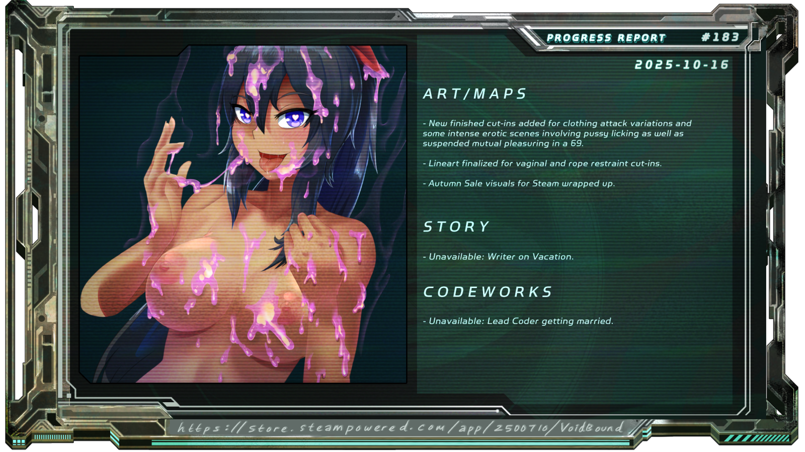 • A fresh batch of cut-ins has been completed, covering scenes like clothing attacks 1 & 2, pussy licking, and an upside-down 69 suspension. Variety is the spice of lewd!