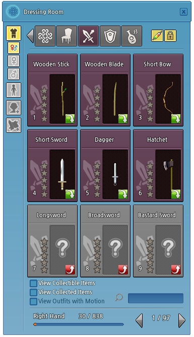 • Some equipable items are unable to be collected in the Dressing Room, such as:
