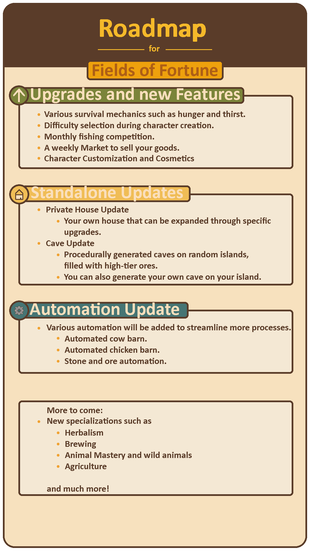 It shows the main updates currently in development, including the private house update, cave exploration, new automation systems, and specializations.