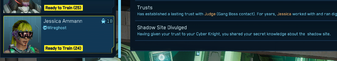 - Revealing the secret about the Shadow Site storyline to the Knight requires Loyalty 6+ on merc, Team Power Level 5+