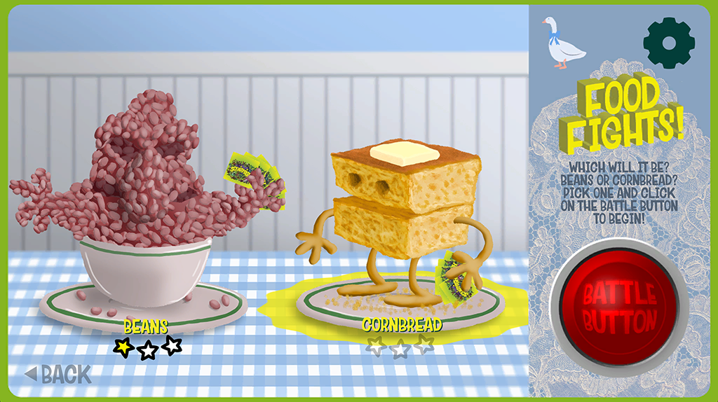 Pictured above: The entryway to the FOOD FIGHTS! section, introducing you to Beans and Cornbread.