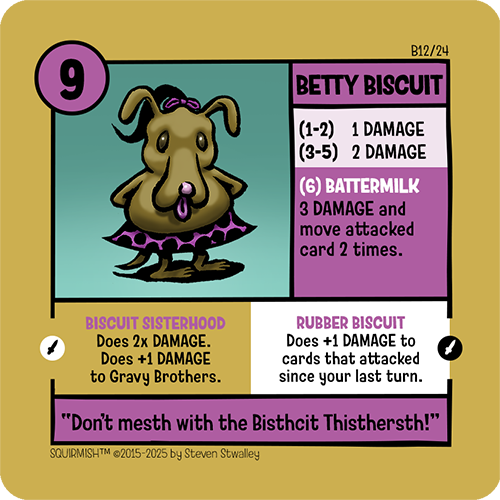 Pictured above: Betty, the eldest of the Biscuit Sisters. First seen in paper form in a booster set for Squirmish: The Card Game (3.0 edition), these rival groups have gone digital and are now part of this new DLC for Squirmish: The Videogame.